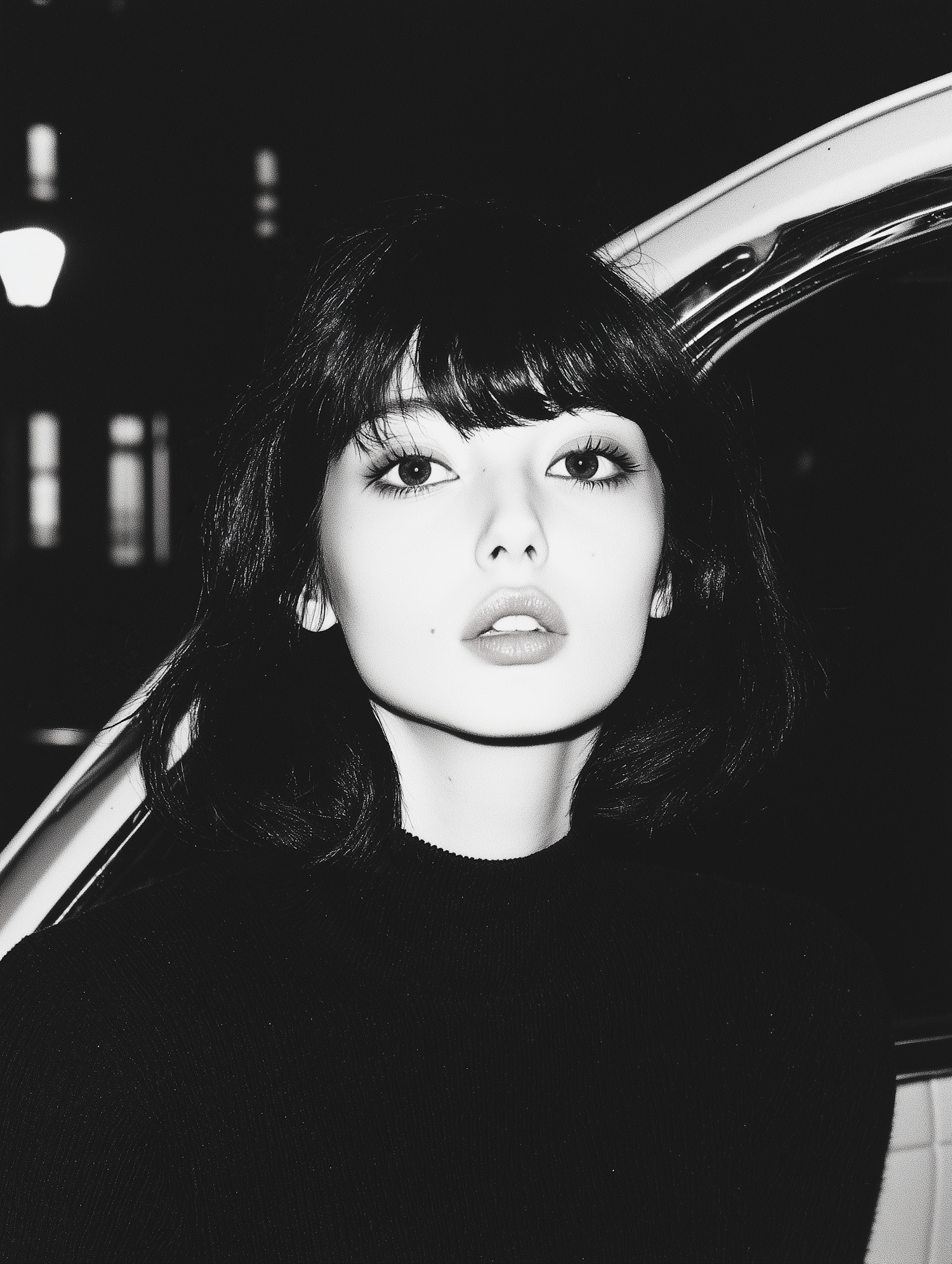 Black and white portrait of a young woman with dark hair and expressive eyes, set against a blurred urban night background.