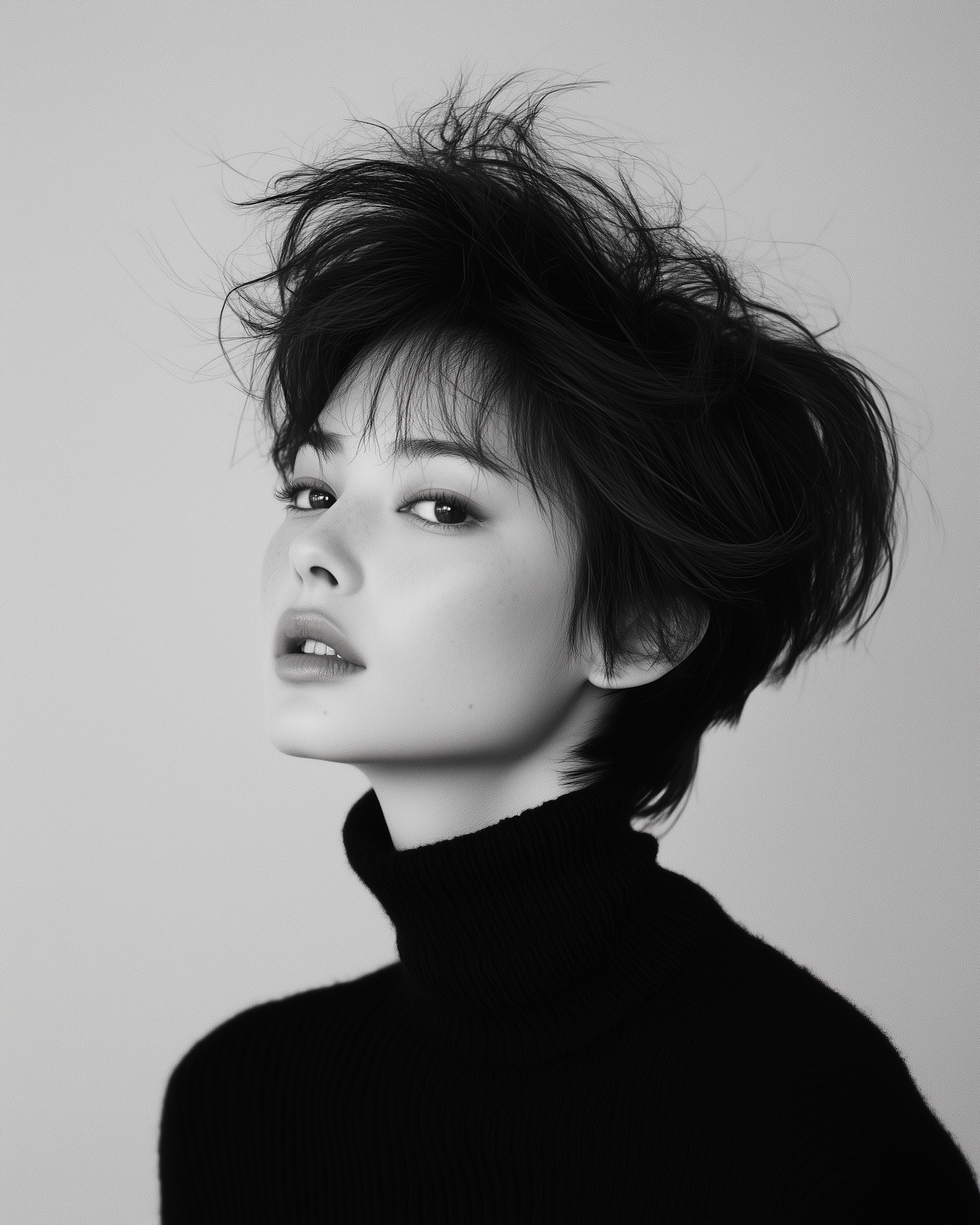 Black and white portrait of a young woman with tousled hair and a black turtleneck, exuding elegance and confidence.