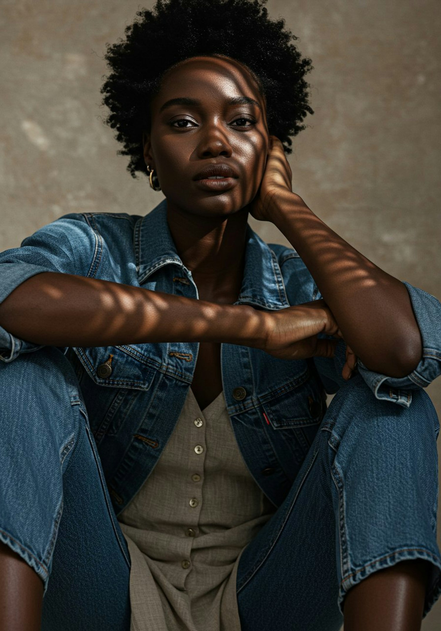 A stylish woman in denim and natural hair sits thoughtfully, with dramatic lighting casting shadows across her face and outfit.