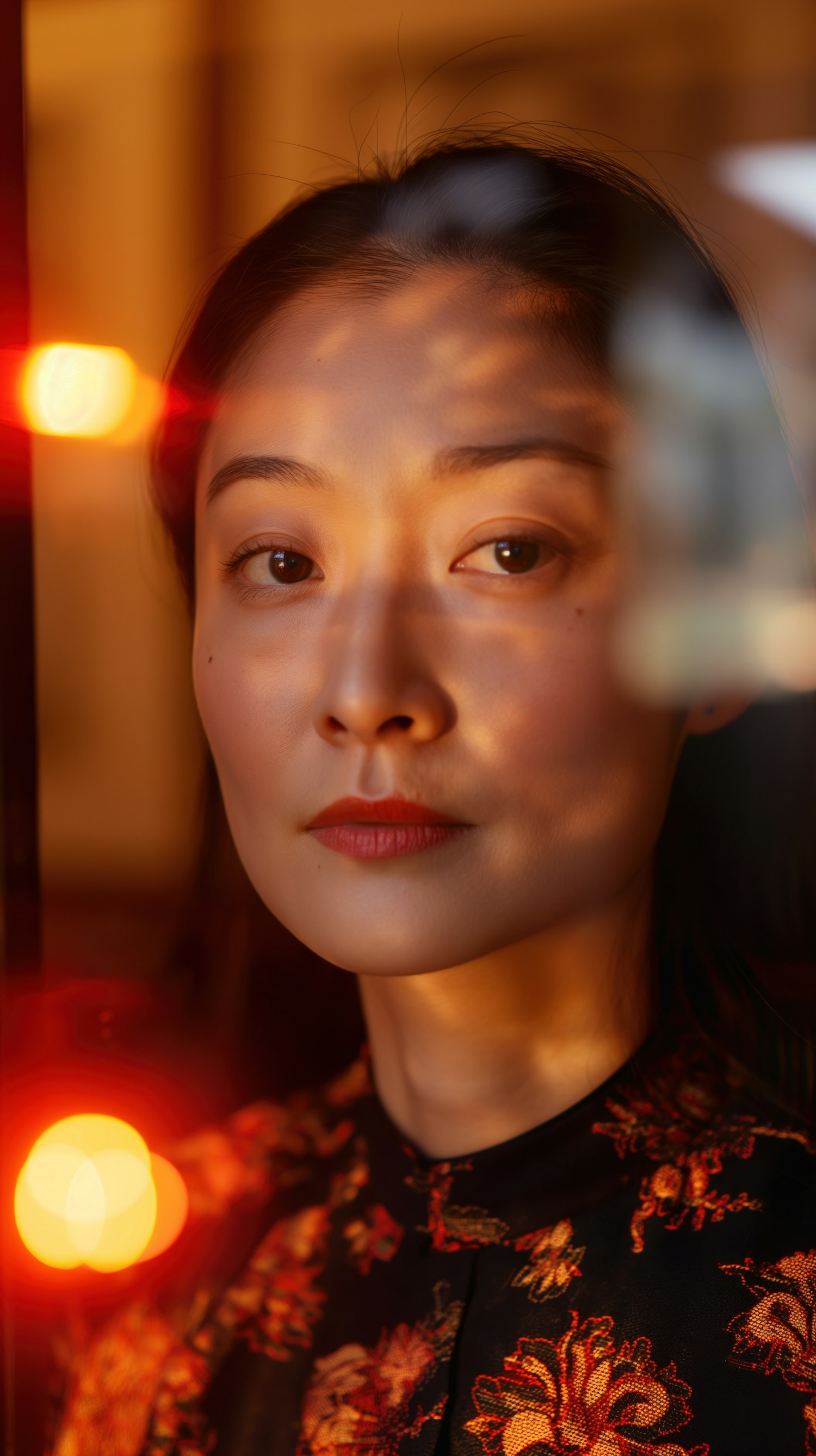 Asian woman in warm light, gazing through a window with a calm expression. Floral top and reflections create a serene atmosphere.