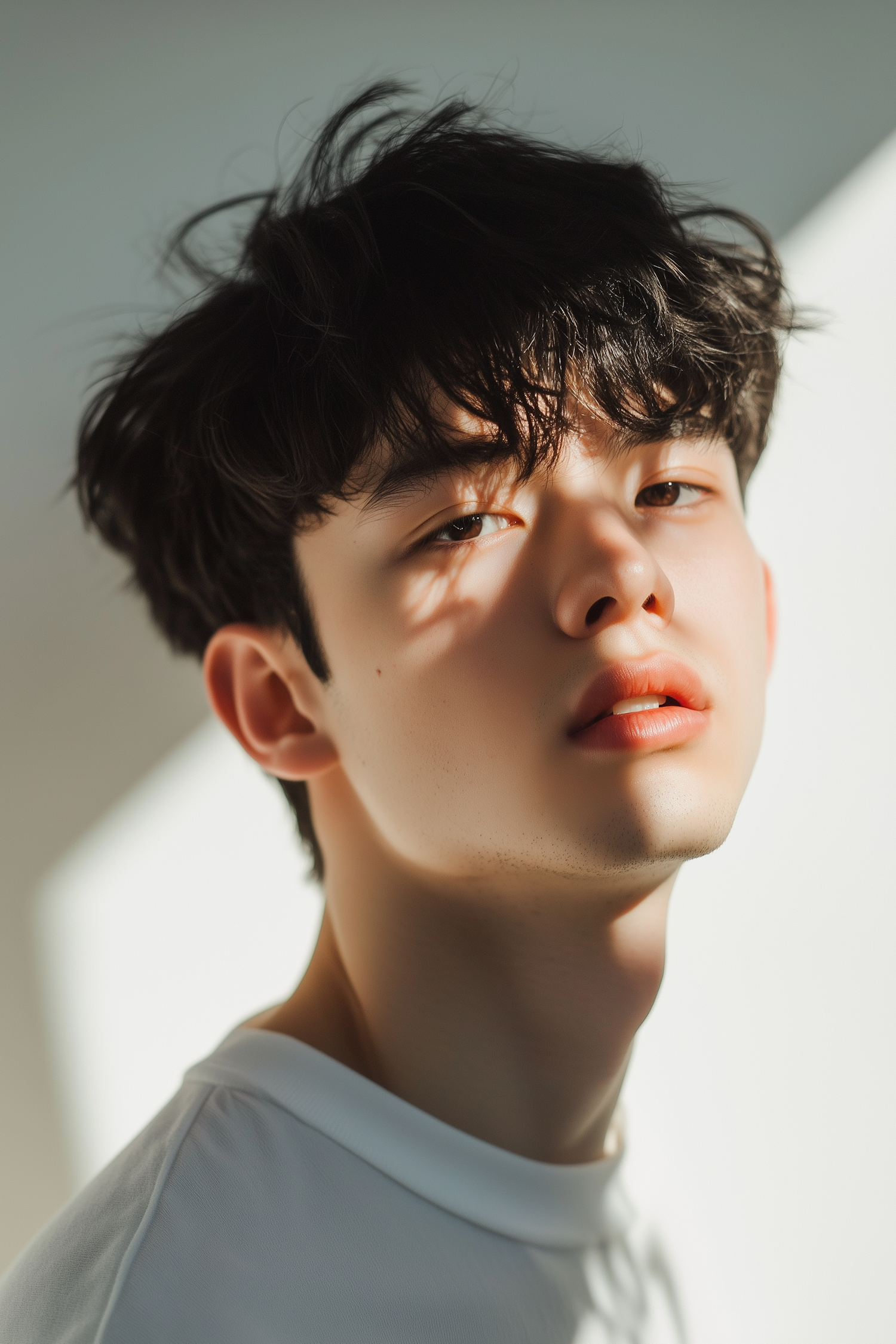 Young Asian male with tousled hair in soft sunlight, wearing a white shirt. Calm expression with gentle shadows on his face.