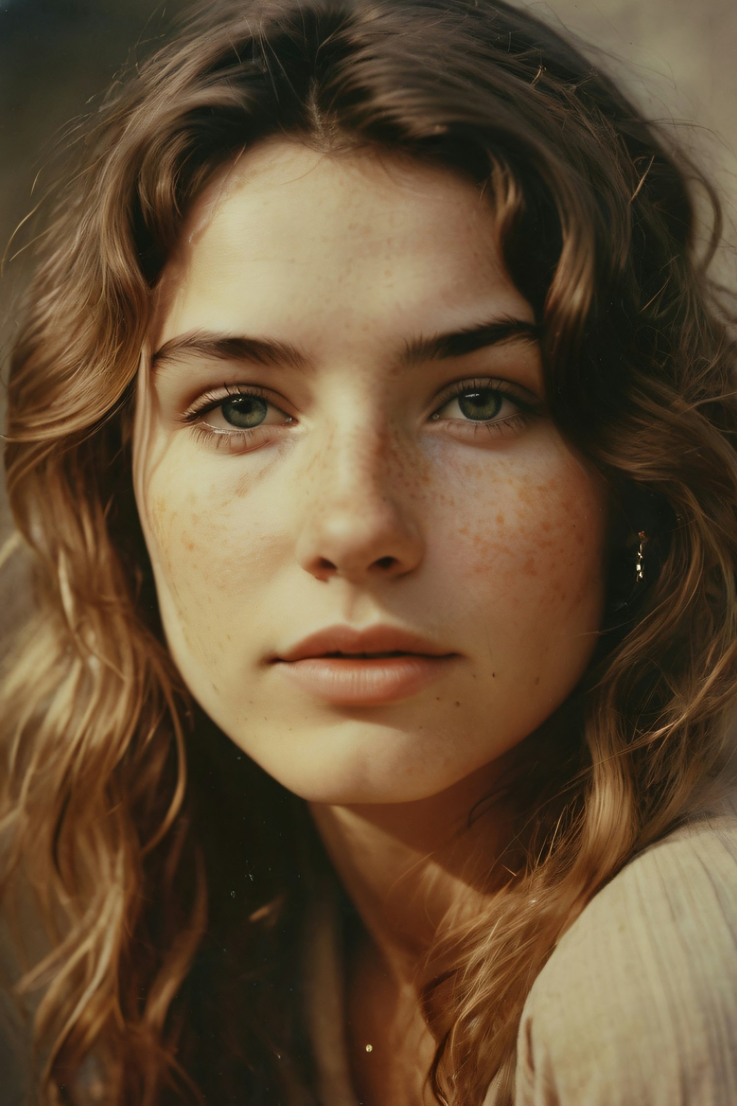 Close-up of a person with long, wavy light brown hair and a blurred face, wearing a light-colored garment in a soft, intimate setting.