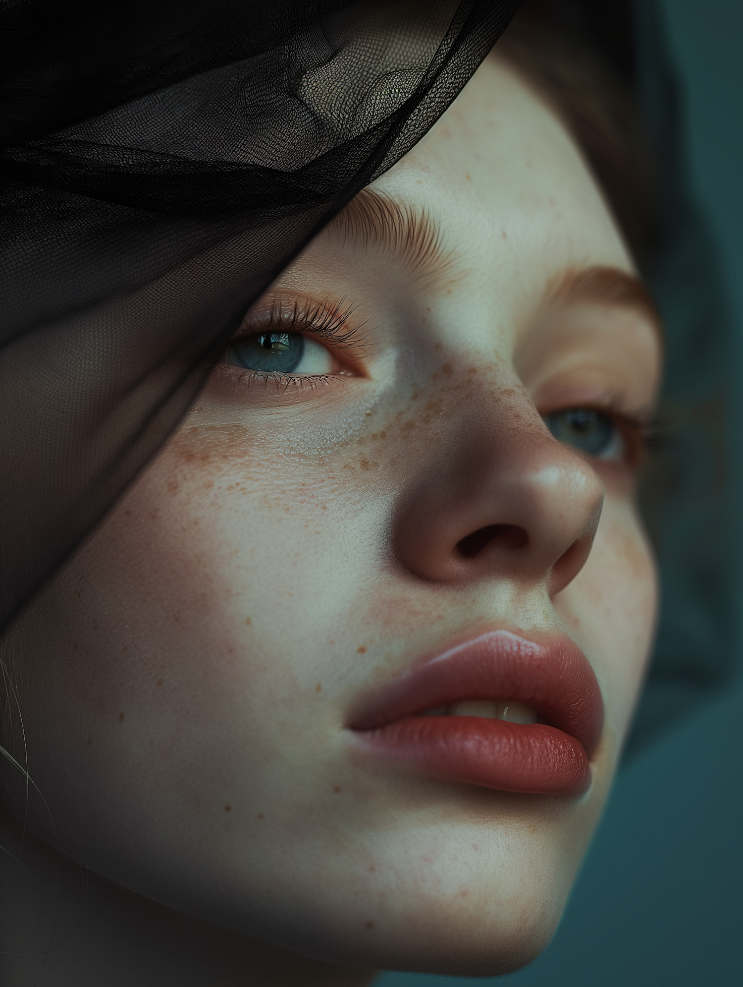 Close-up portrait of a young woman with freckles, blue eyes, and sheer black fabric draped over her head, creating a mysterious look.