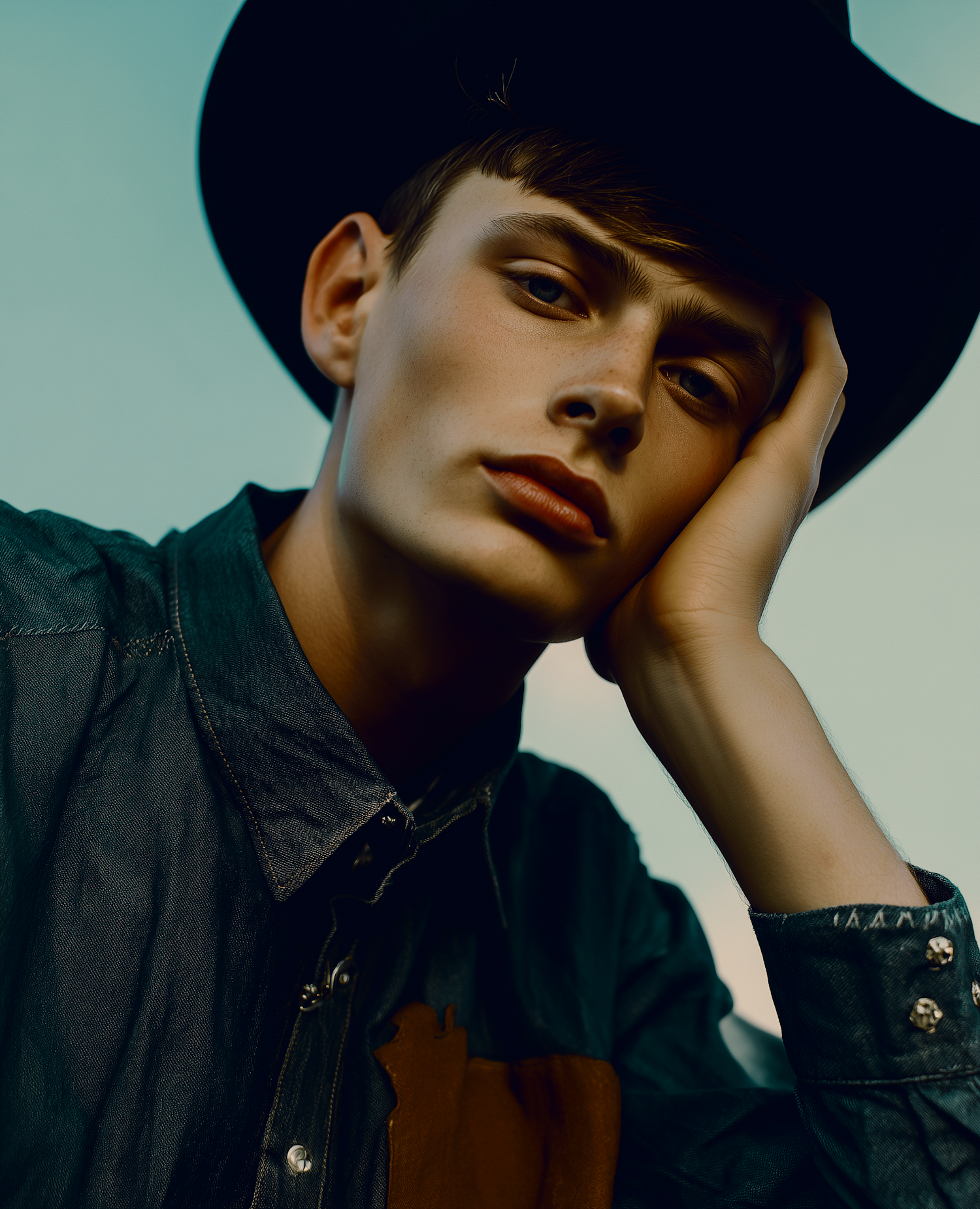 A young person in a denim shirt and black hat rests their head on their hand, gazing thoughtfully against a soft blue background.