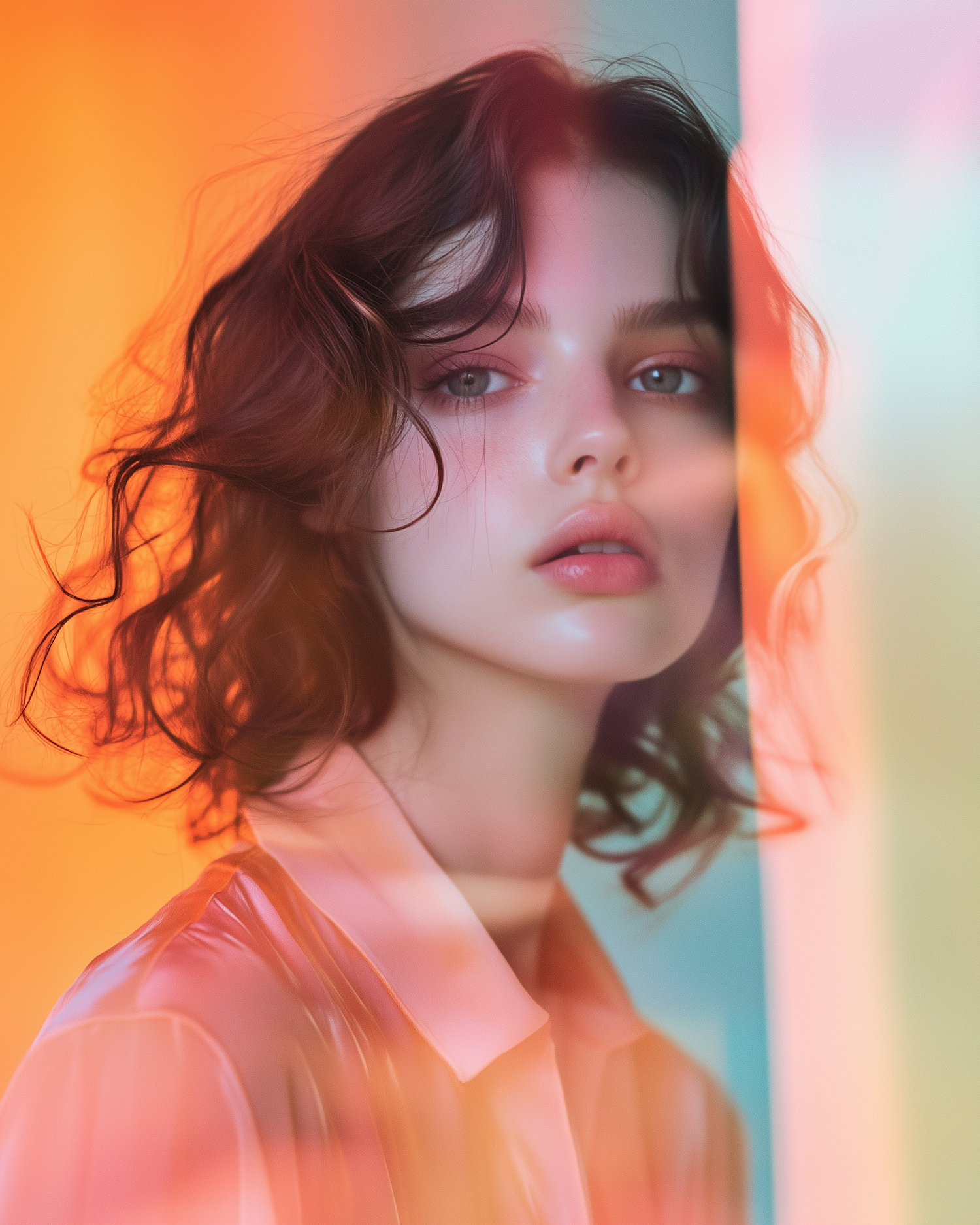 Ethereal portrait of a young woman with wavy hair and soft lighting, set against a dreamy orange and blue background.