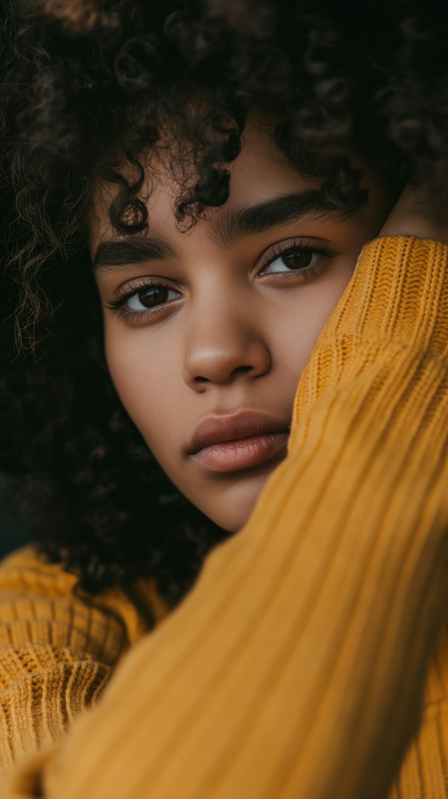 Close-up portrait of a young woman with curly hair and a mustard yellow sweater, exuding warmth and introspection.