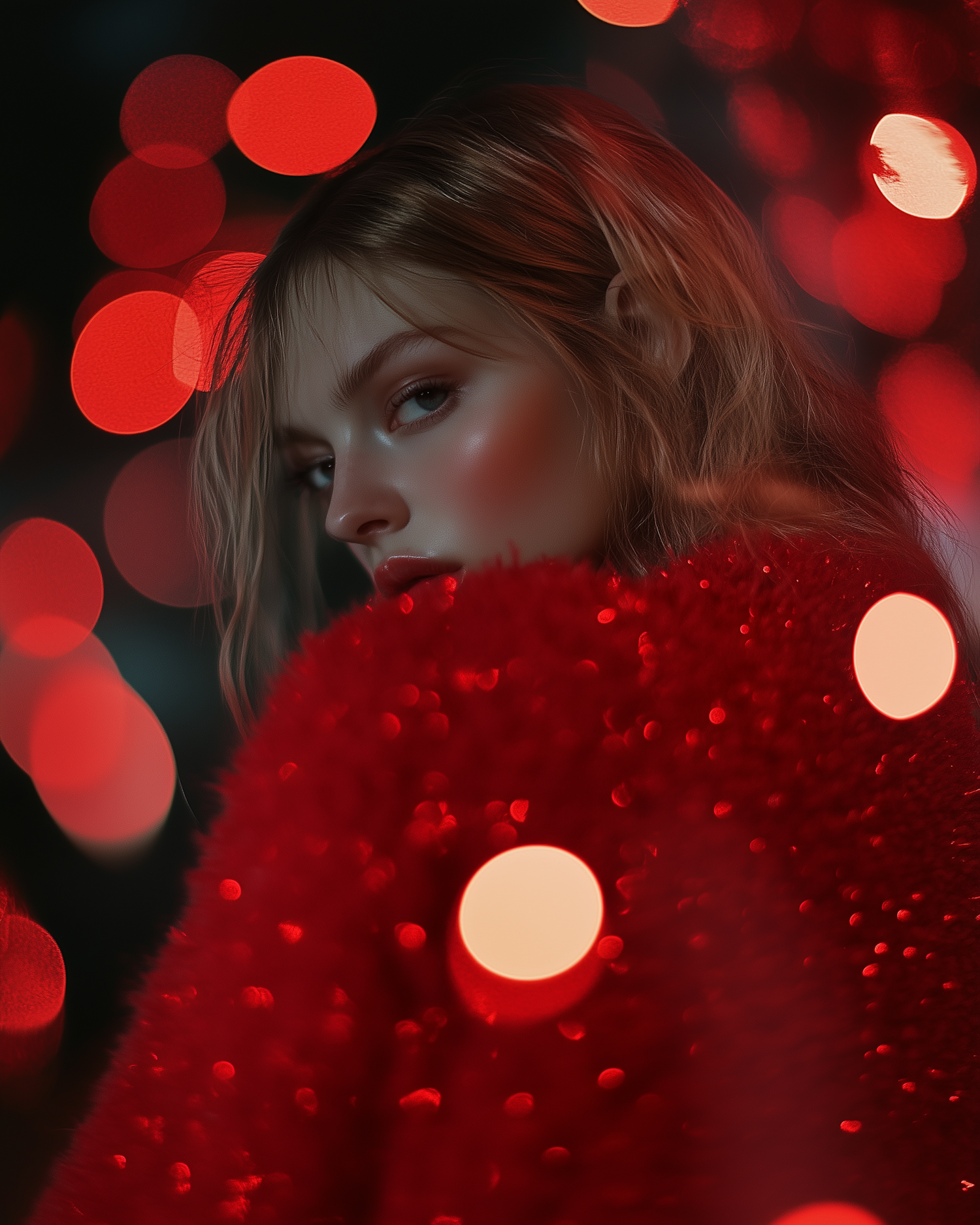 A young woman in a red sweater with blonde hair, surrounded by red bokeh lights, creates a dreamy and festive atmosphere.