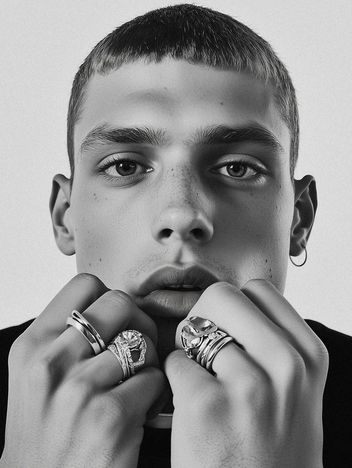 Black-and-white close-up of a young man with bold rings, short hair, and intense gaze, highlighting intricate jewelry details.