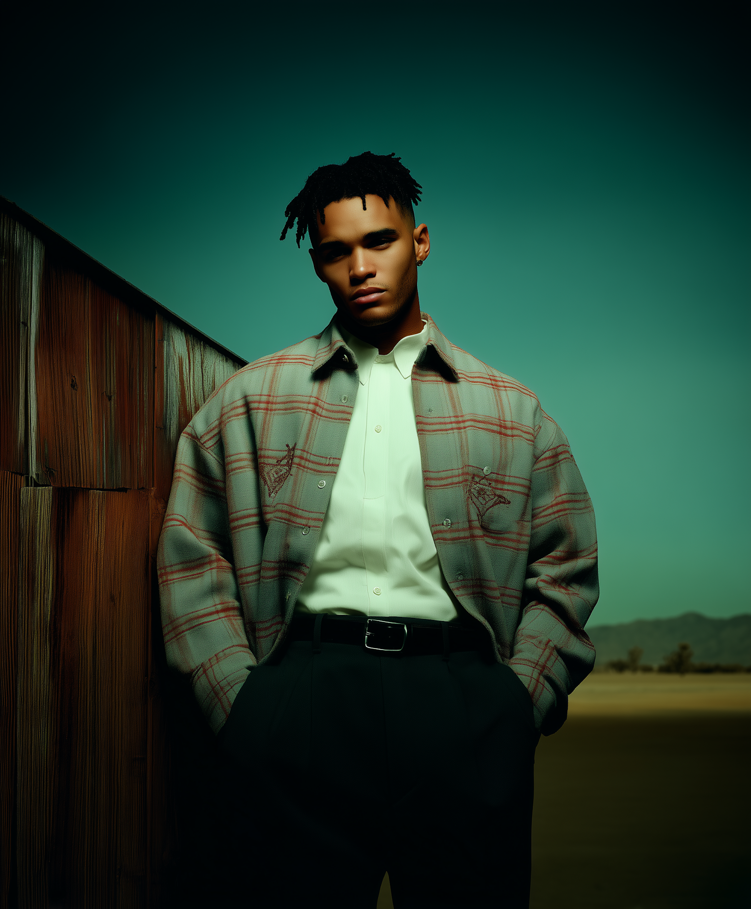Stylish young man in plaid jacket and white shirt, standing against a wooden wall with a desert backdrop and teal sky.