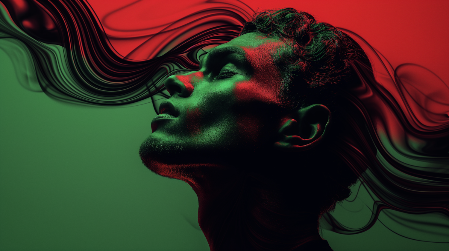 Surreal portrait with dramatic red and green lighting, featuring abstract flowing lines and a contemplative expression.