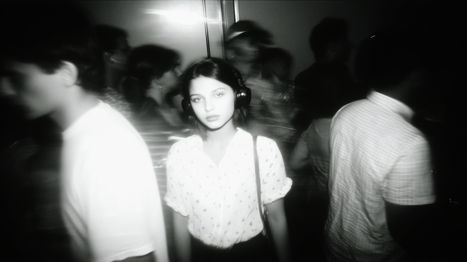 A monochrome photo of a young woman with headphones in a crowd, standing still while others move around her, creating a dynamic contrast.