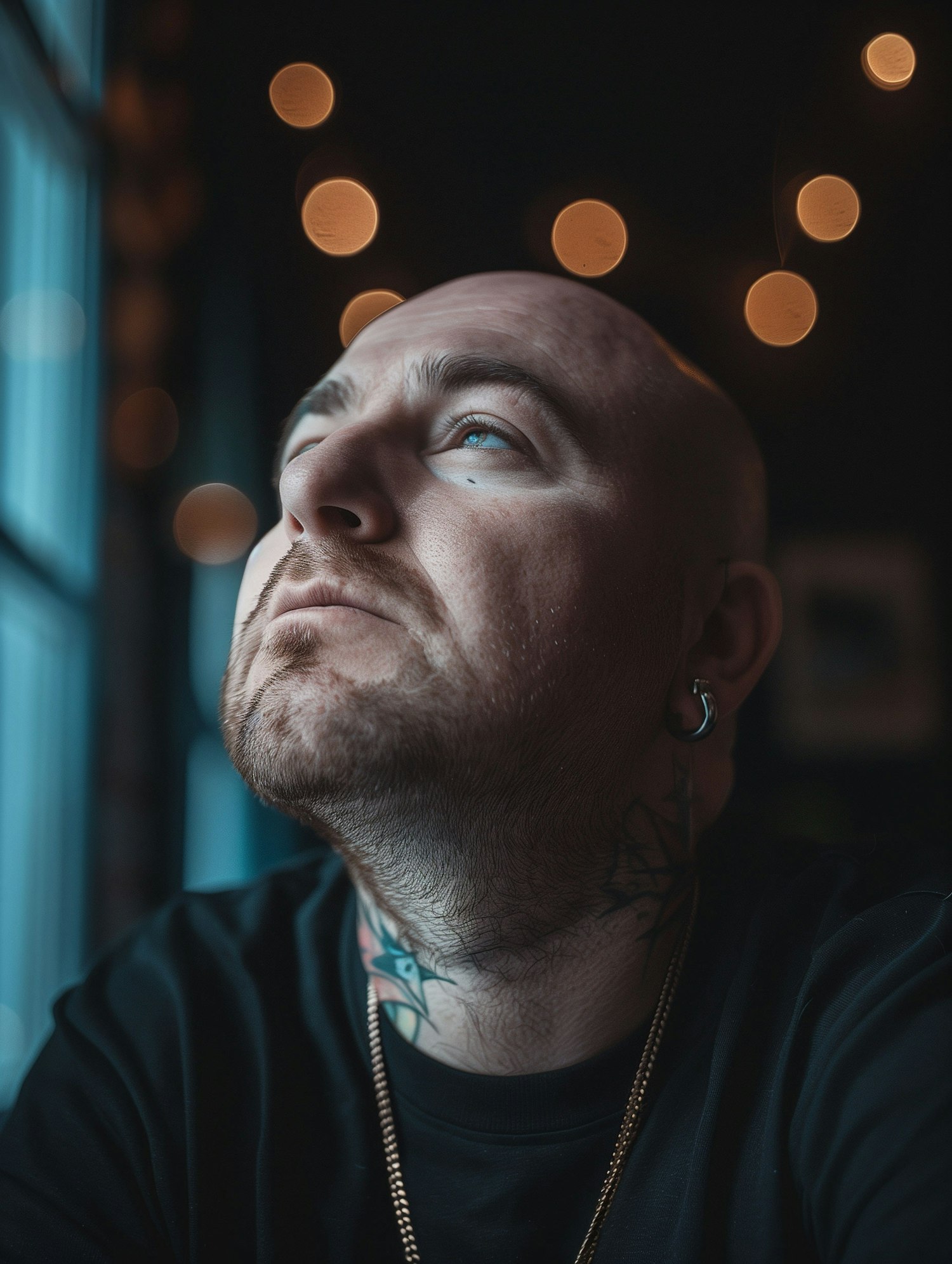 Bald man with tattoos and a contemplative gaze, surrounded by warm bokeh lights. Blue eyes, short beard, and gold chain add character.