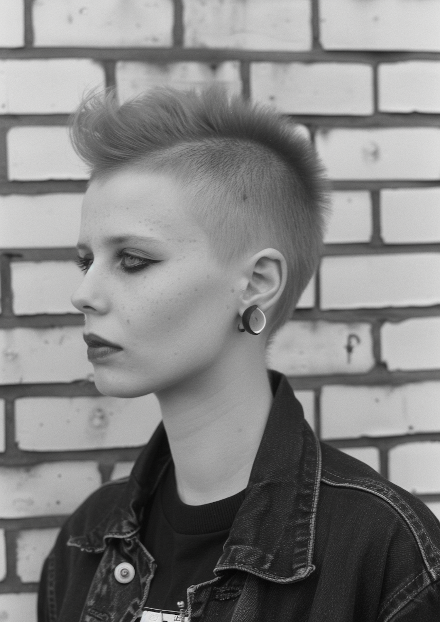 Black and white portrait of a person with a punk mohawk, dark eyeliner, and denim jacket against a brick wall.