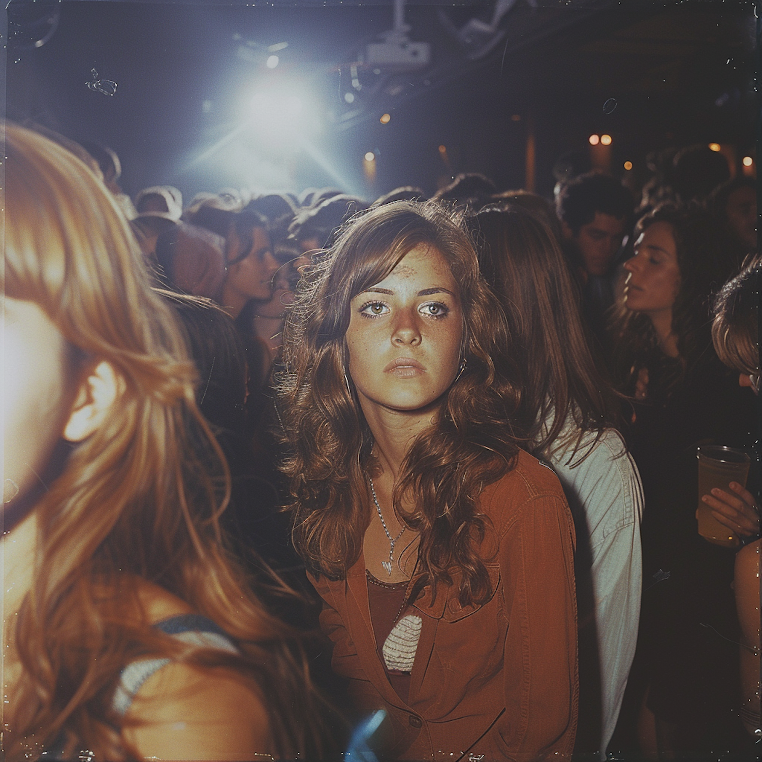 Young woman with wavy brown hair in a crowded club, wearing a brown jacket and necklace, gazing seriously at the camera.