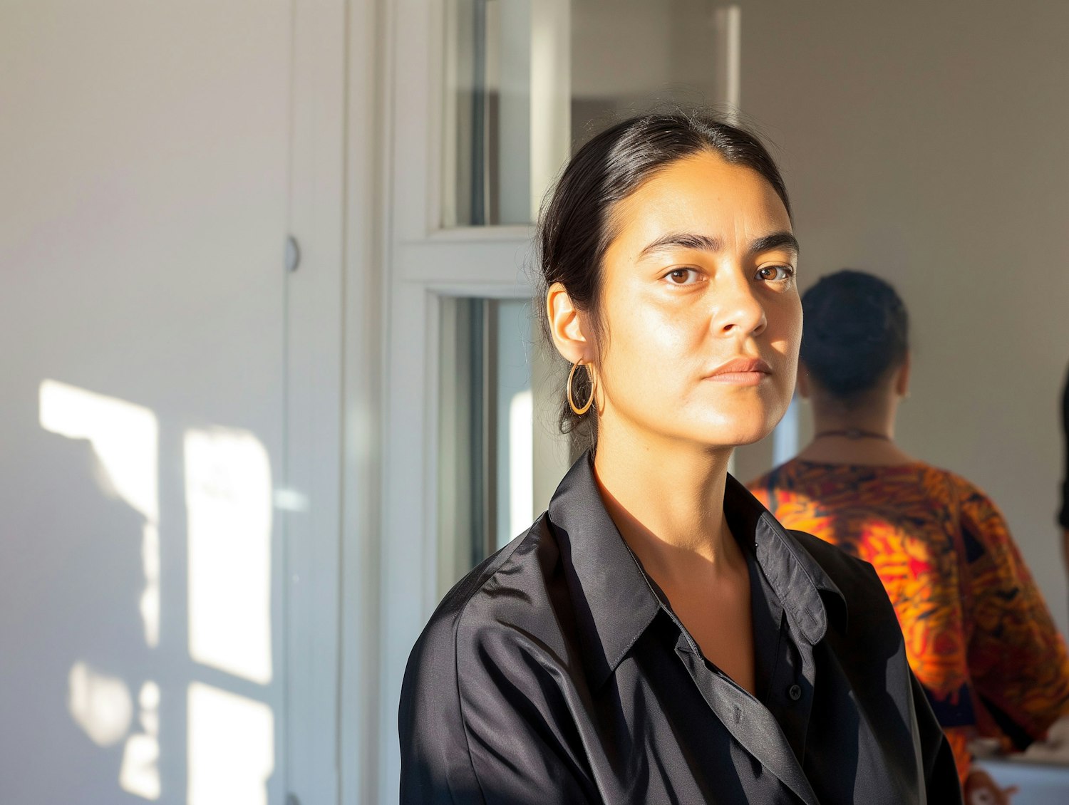 Woman with dark hair and gold hoop earrings in a sunlit room, wearing a black shirt. Reflection shows another person in a colorful shirt.