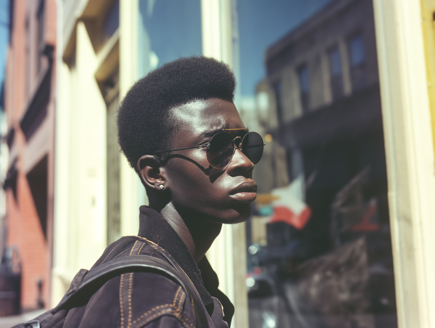 Stylish young man with sunglasses and a high-top fade in an urban setting, exuding confidence and modern fashion sense.