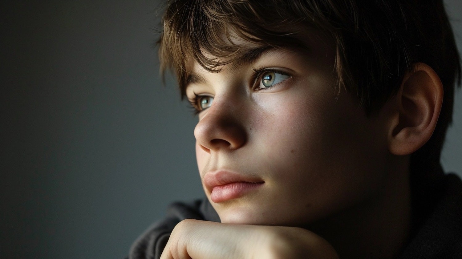 Thoughtful young boy with brown hair and blue eyes gazes into the distance, resting his chin on his hand in soft lighting.