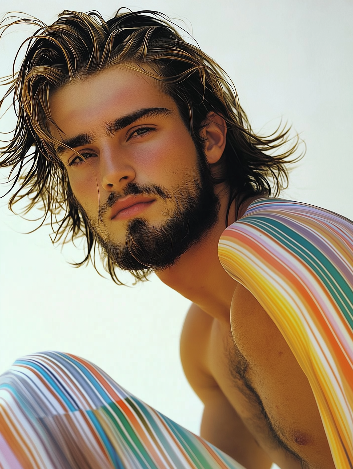 Young man with long hair and beard, draped in colorful striped fabric, gazes intently. Neutral background enhances vibrant contrast.
