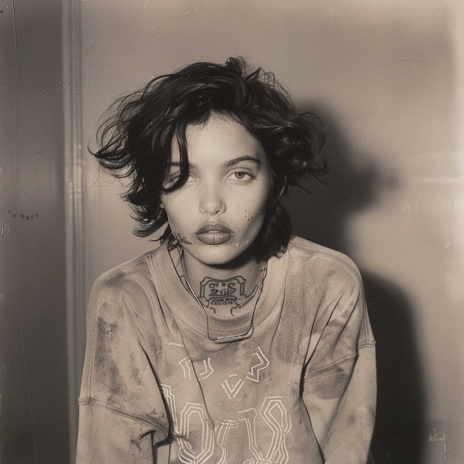 Black-and-white portrait of a tattooed woman with short dark hair, wearing a casual sweatshirt, gazing intensely at the camera.