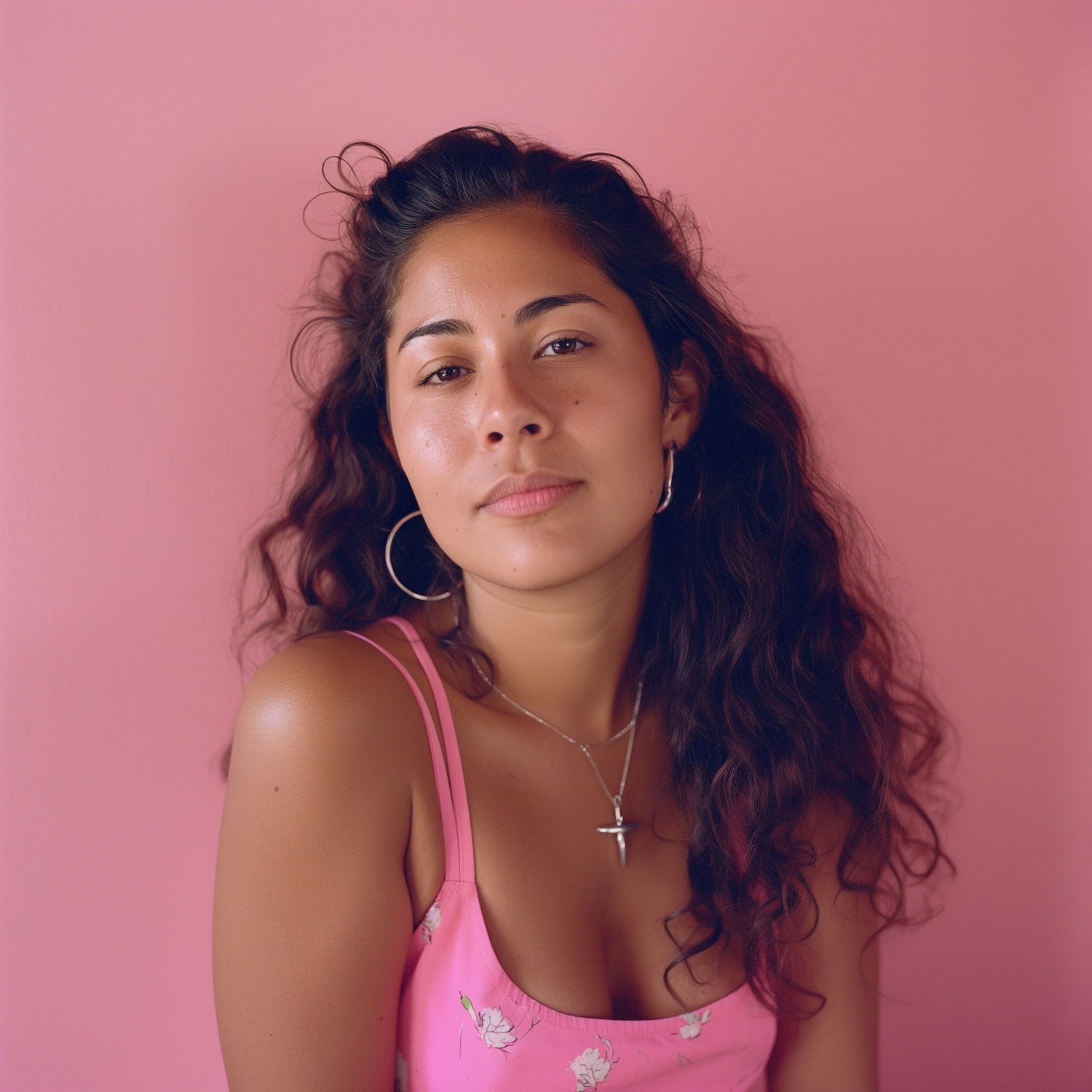 Portrait of a young woman with wavy hair against a pink background, wearing a floral top and hoop earrings, exuding confidence and calm.