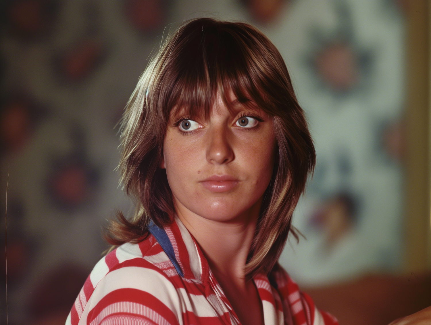 Young woman with light brown hair and blue eyes in a red striped shirt, gazing thoughtfully. Warm lighting and blurred background.