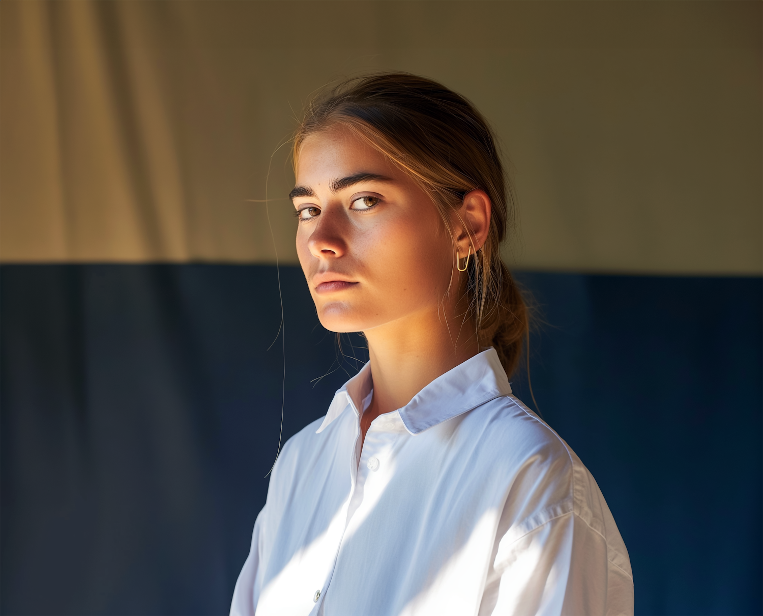 Portrait of a young woman with light brown hair and a white shirt, set against a beige and blue background.