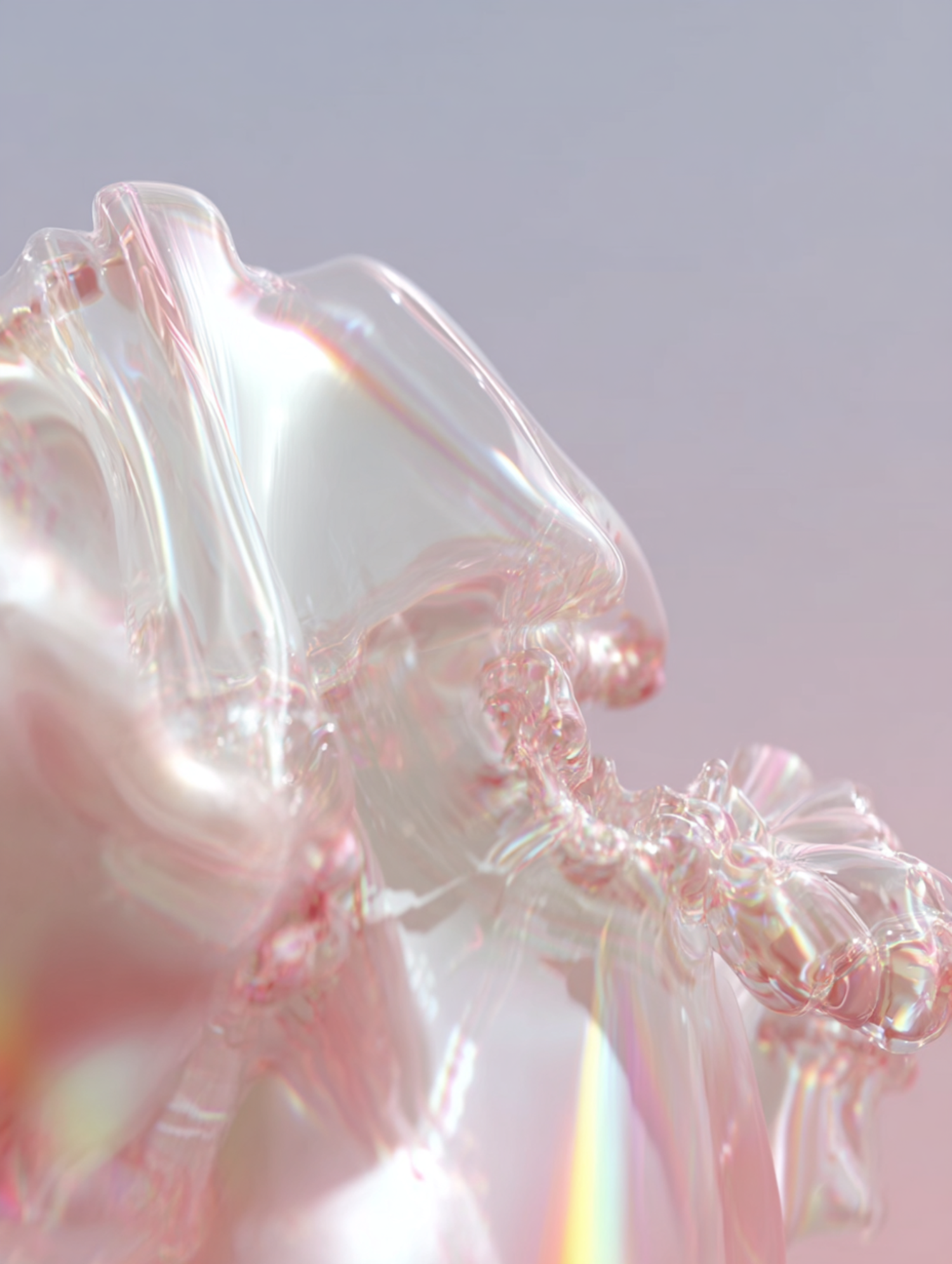 Abstract translucent material with iridescent hues and organic shapes, set against a soft pink and lavender gradient background.