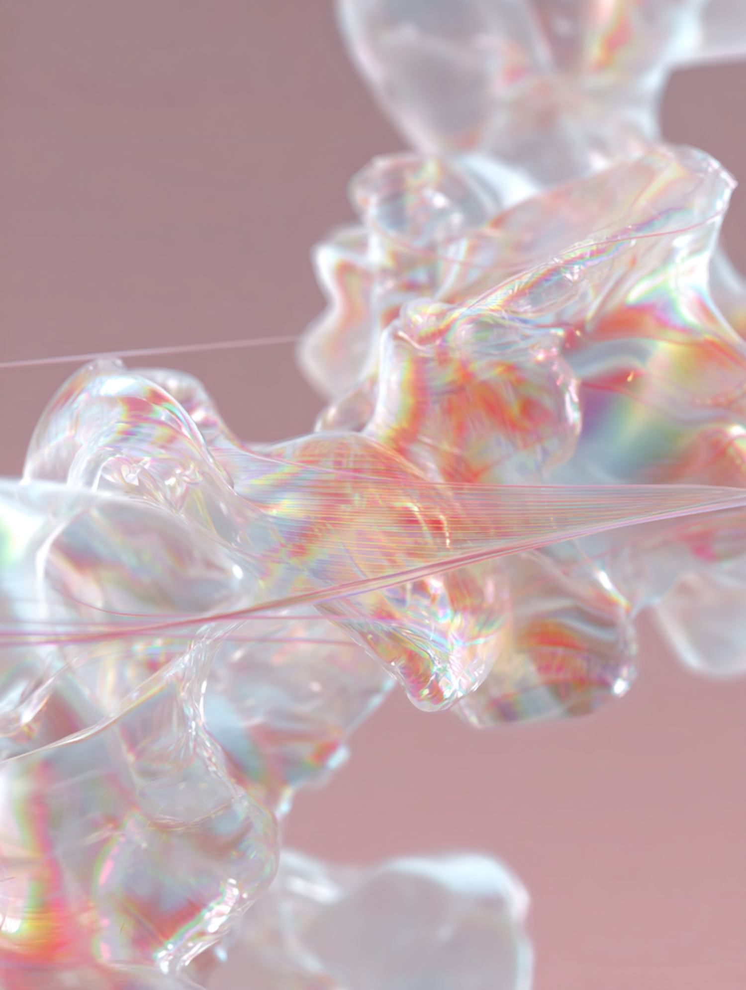 Abstract iridescent shapes with flowing forms and a soft pink background, creating a mesmerizing and modern visual aesthetic.