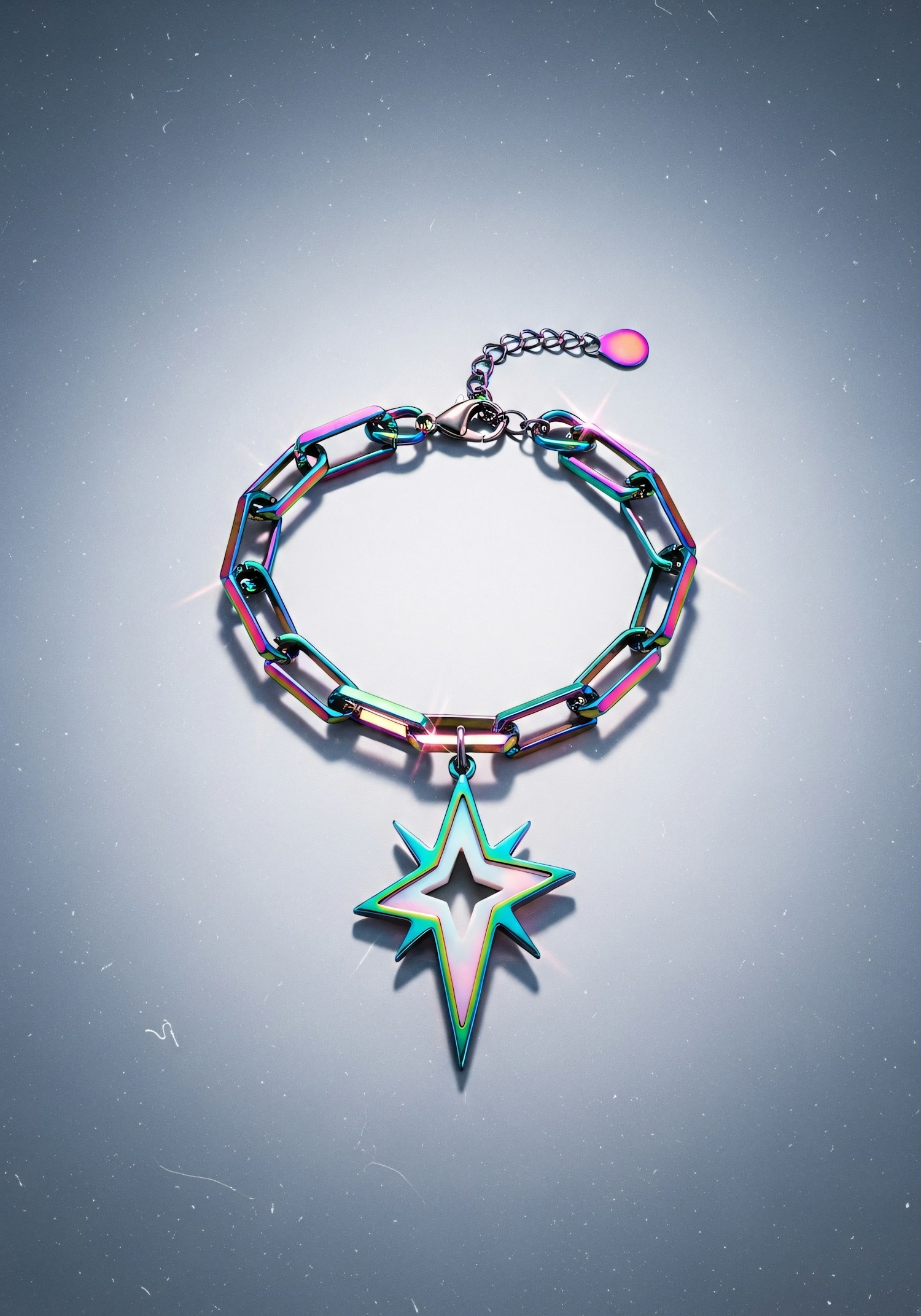 A modern iridescent bracelet with a star-shaped pendant, featuring a chain-link design and vibrant colors on a gradient background.