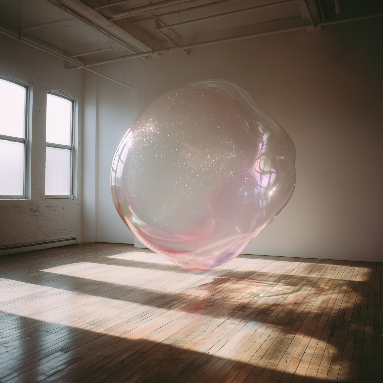 A large, iridescent bubble floats in a sunlit room with wooden floors and white walls, creating a surreal and ethereal atmosphere.