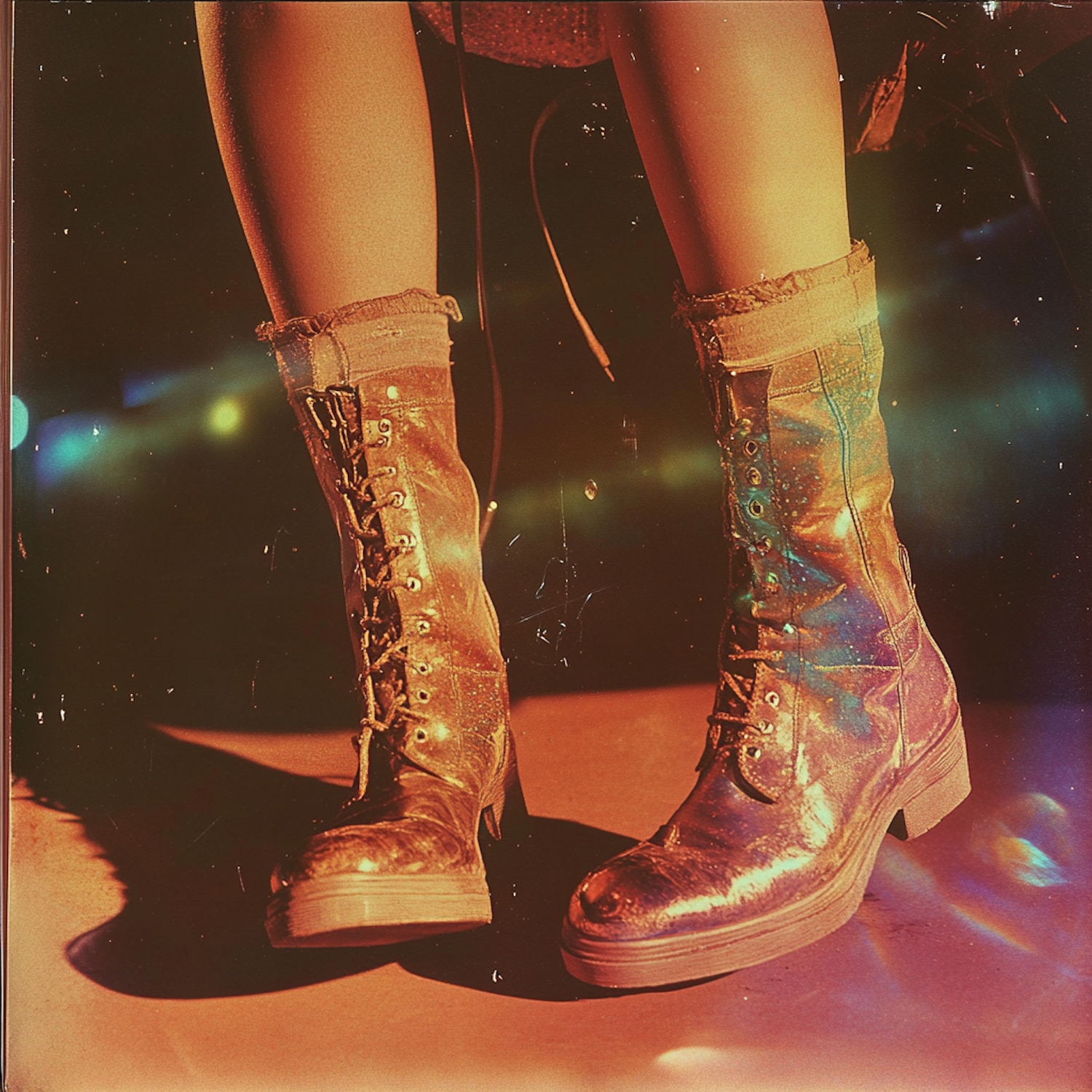 Shiny metallic combat boots with iridescent colors and light socks, set against a warm, dramatic background.