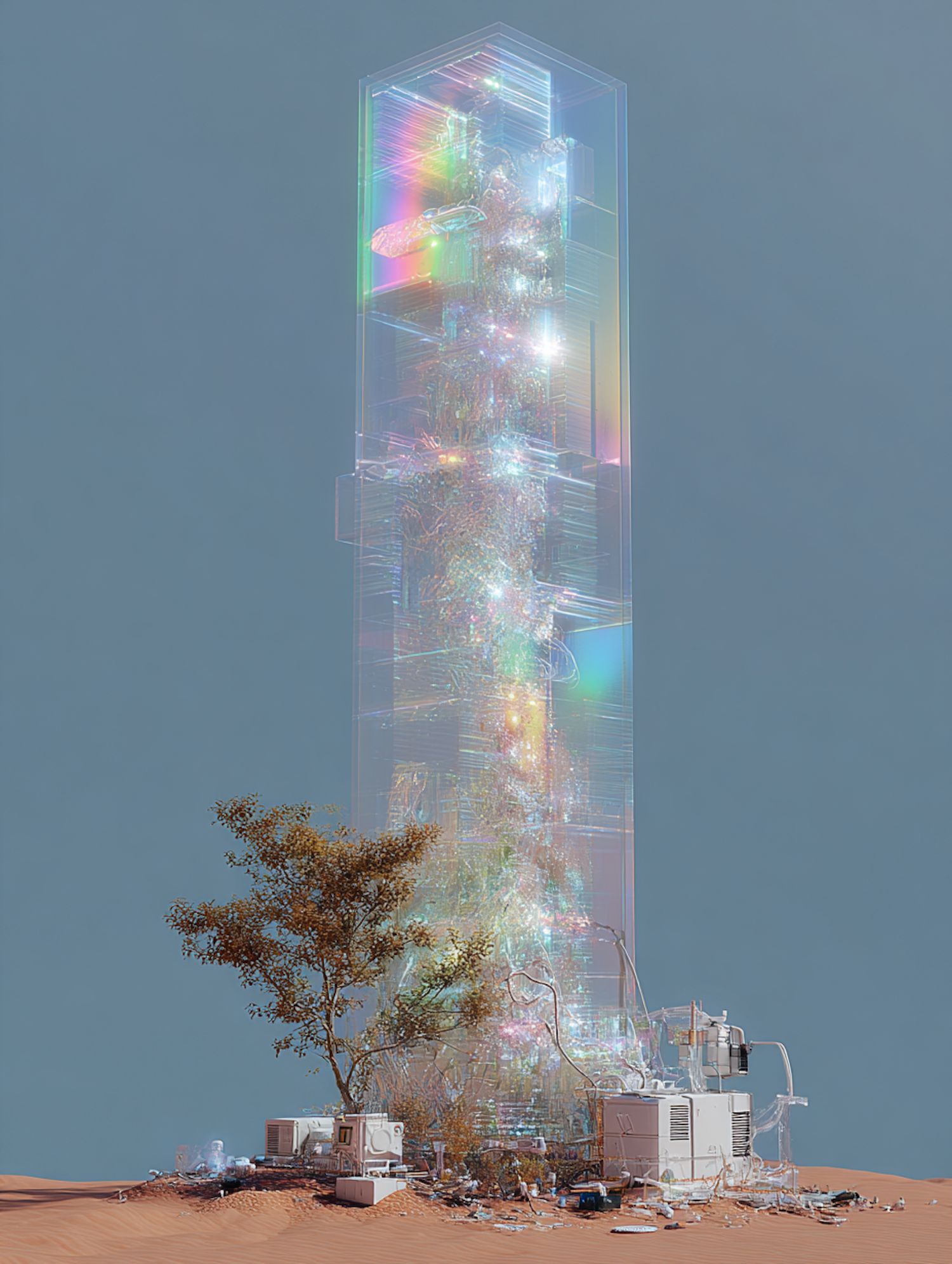 A futuristic iridescent tower in a desert, surrounded by scattered tech equipment and a lone tree, under a clear blue sky.