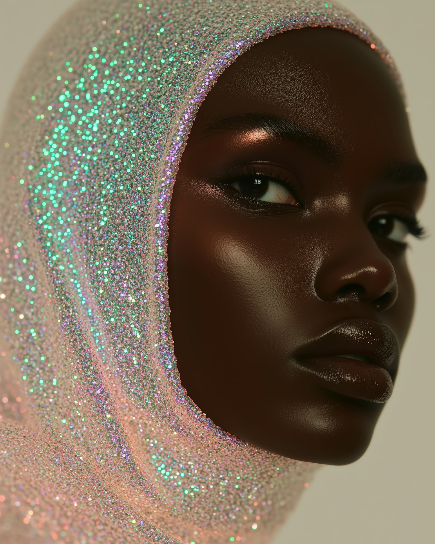 Close-up of a woman in a sparkling iridescent hijab, highlighting her dark skin and expressive eyes.