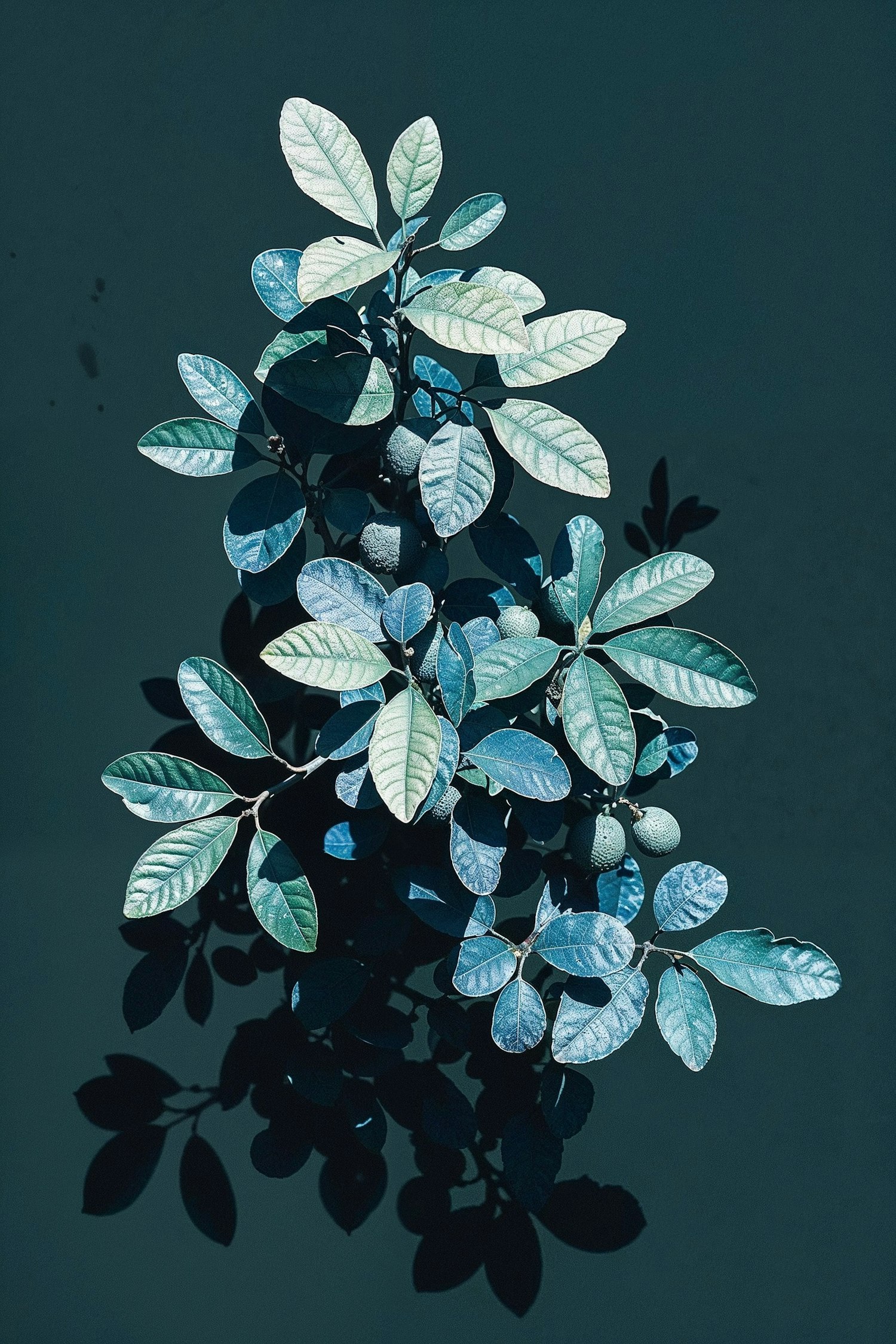 Vibrant green and blue leaves with striking shadows against a dark background, highlighting natural beauty and texture.