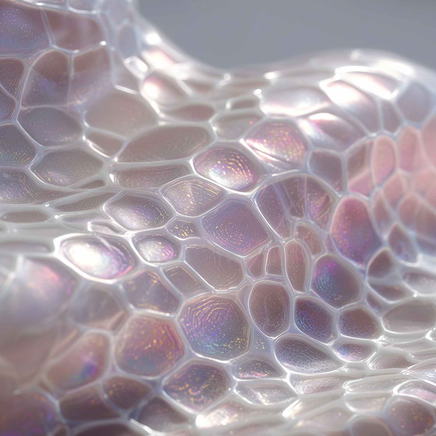 Close-up of a translucent, iridescent honeycomb-like surface with shimmering colors and intricate textures, creating a futuristic aesthetic.