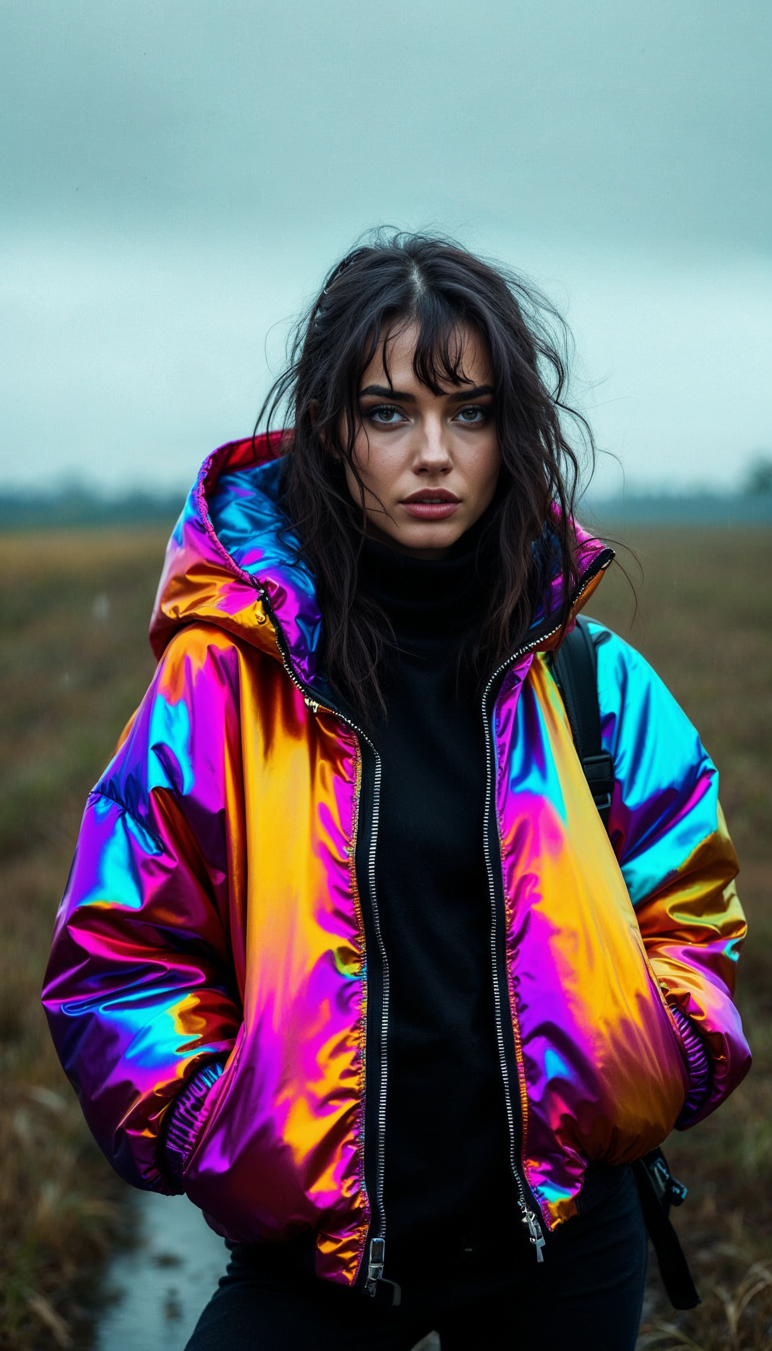 Woman in vibrant iridescent jacket stands in a field, exuding confidence and style against a muted, overcast backdrop.
