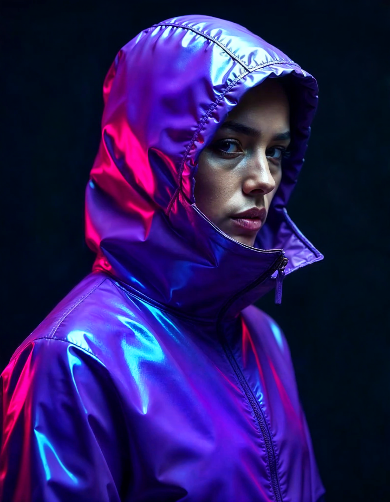Person in a shiny purple and pink iridescent jacket with hood, set against a dark background, creating a striking visual contrast.