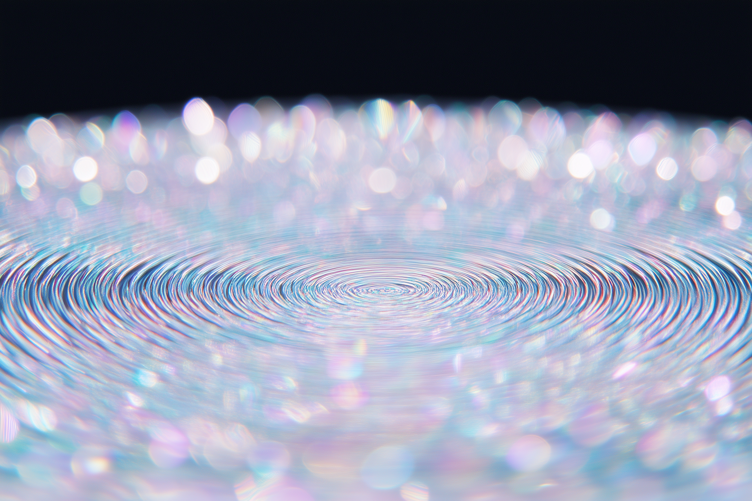 Hypnotic ripples on a liquid surface with pastel iridescence and sparkling bokeh, creating a dreamy and abstract visual effect.