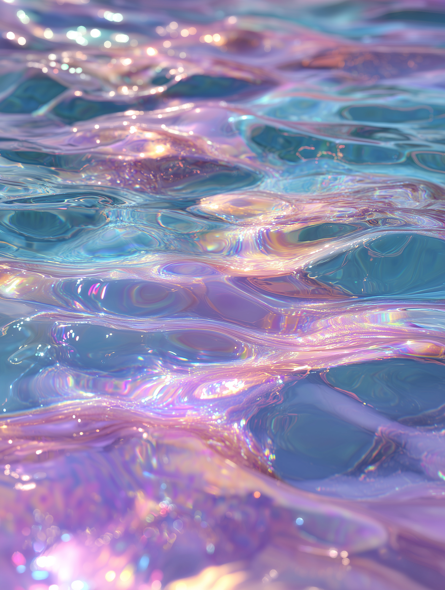 A close-up of shimmering, iridescent liquid with ripples reflecting hues of pink, blue, and gold, creating a dreamy, abstract effect.