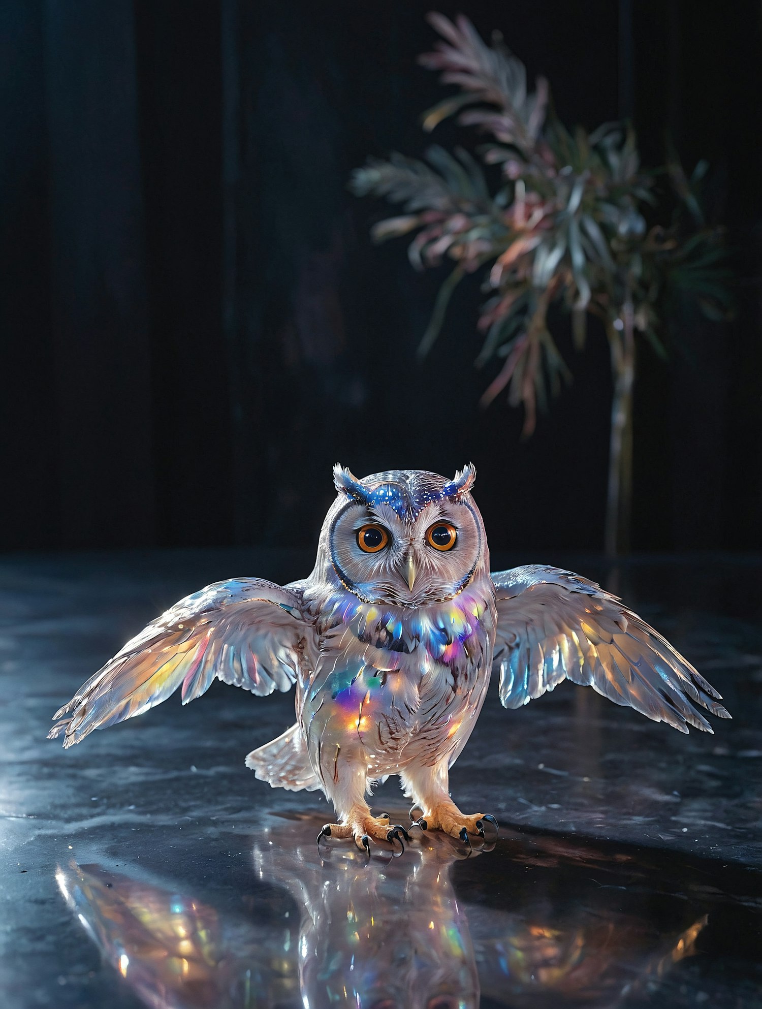Iridescent owl figurine with spread wings on a reflective surface, showcasing vibrant colors and lifelike details.