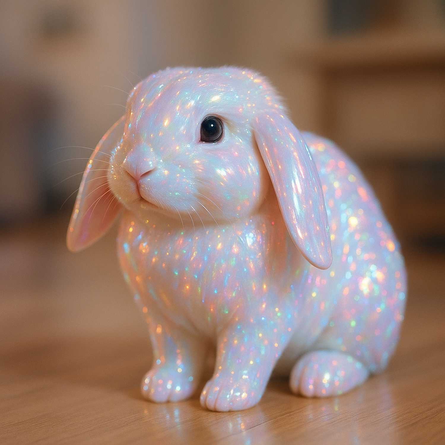A shimmering white rabbit with an iridescent coat sits on a wooden floor, its fur reflecting a spectrum of colors in soft lighting.