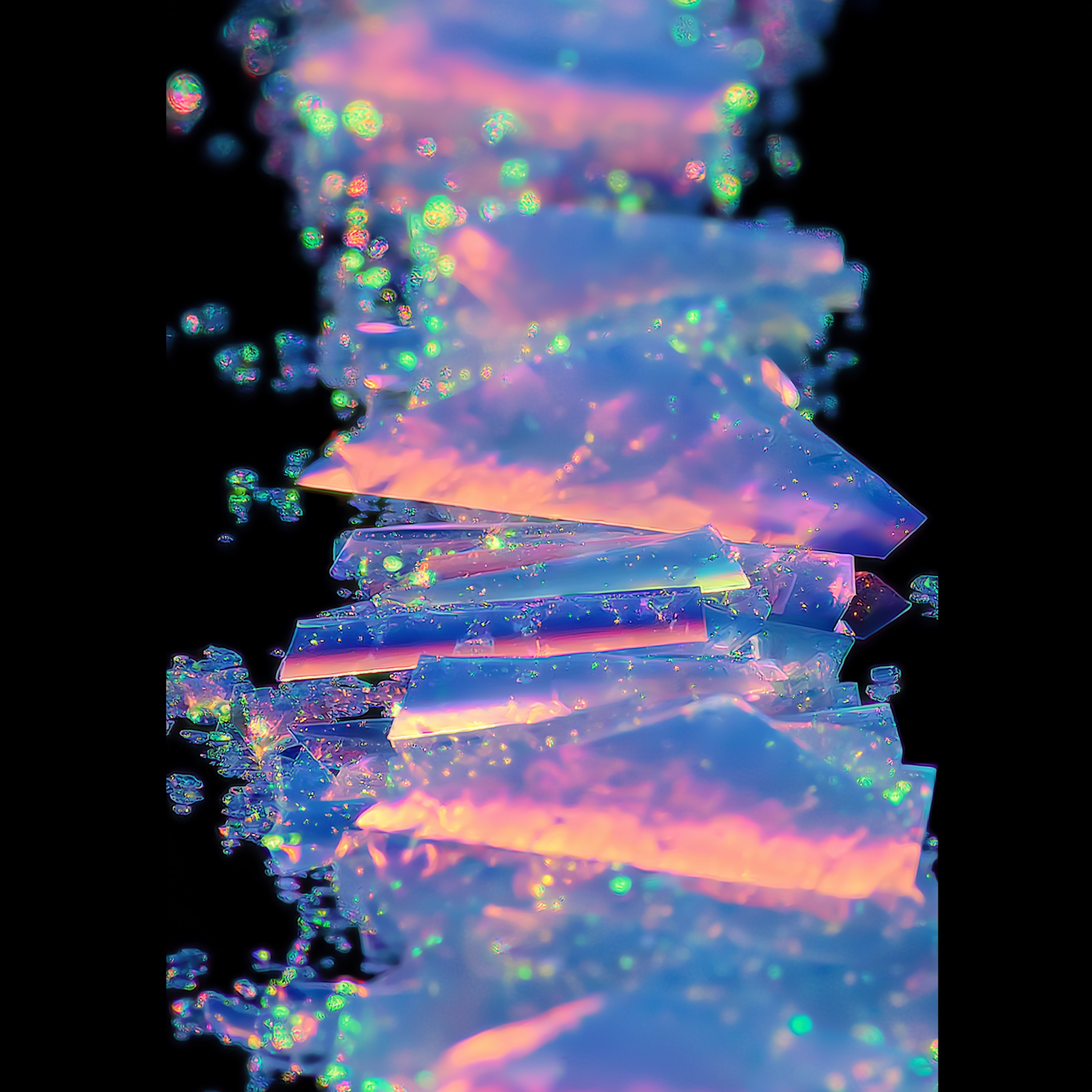 Iridescent shards glowing in pink, blue, and green hues, layered and scattered against a black background, creating a dazzling visual effect.