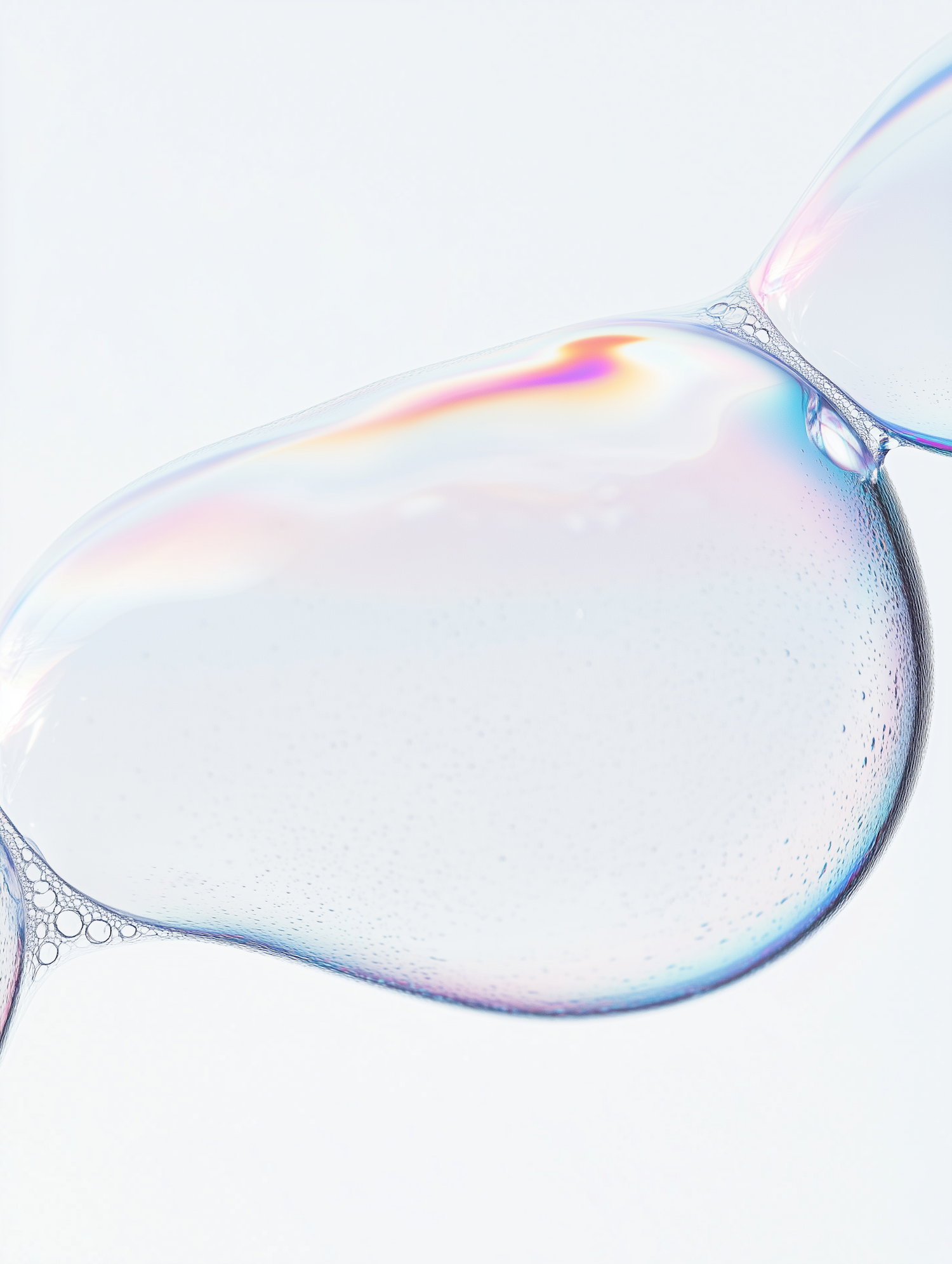 Close-up of iridescent soap bubbles with soft pink, blue, and yellow hues on a clean, light background. Delicate and mesmerizing details.