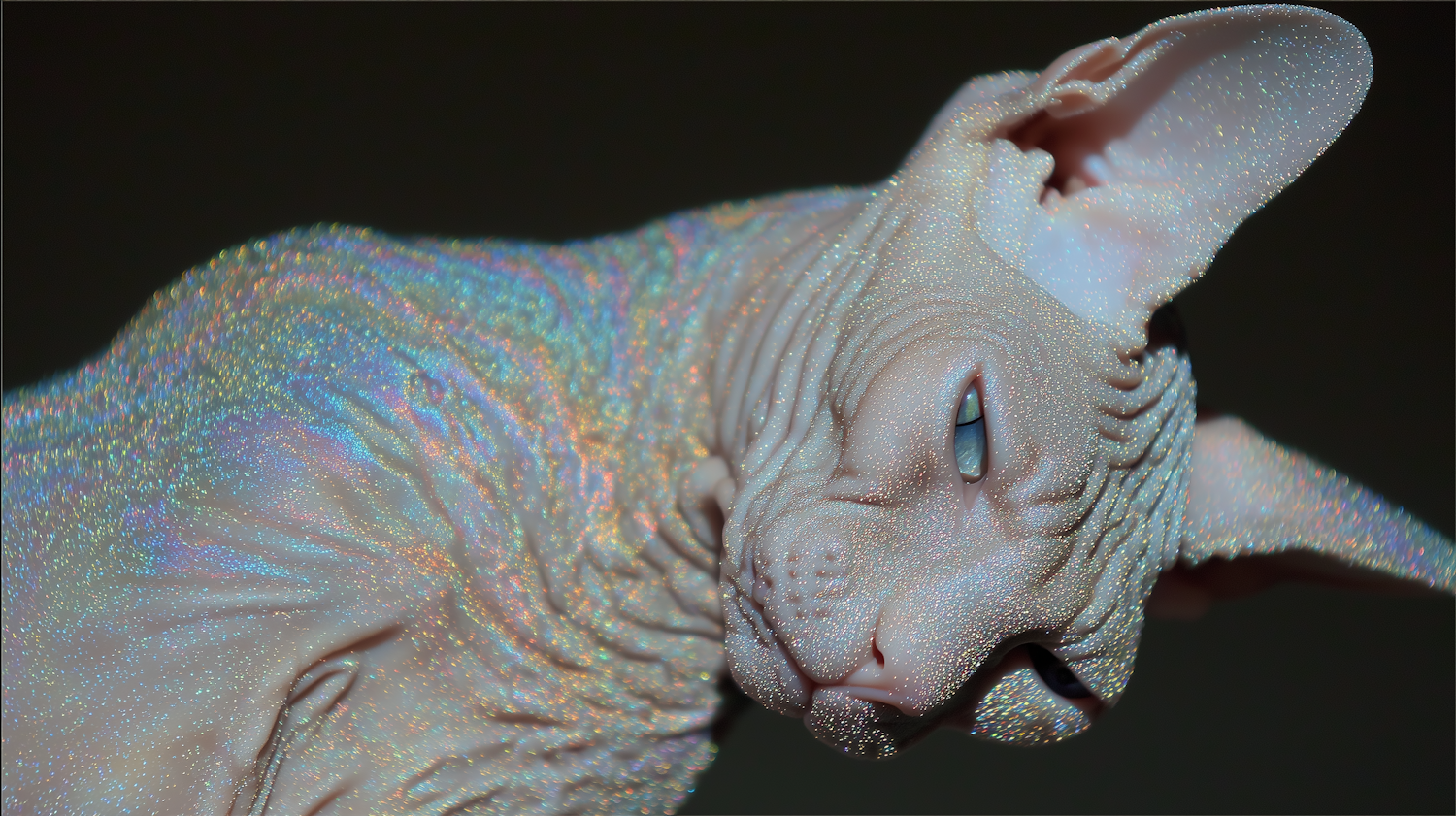 A hairless sphynx cat with sparkling skin reflecting colorful light, set against a dark background for dramatic contrast.