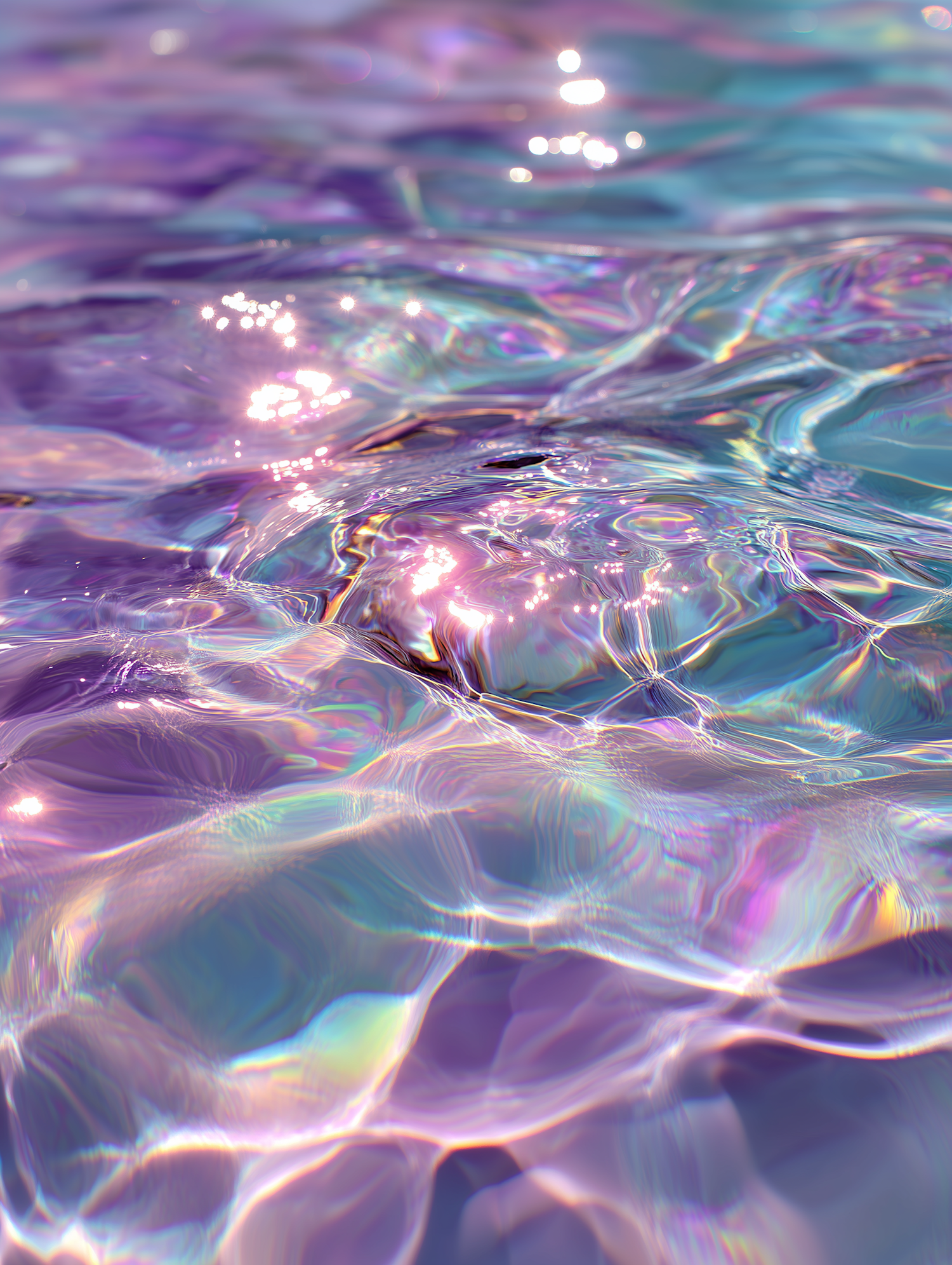 A mesmerizing close-up of shimmering water with iridescent hues of purple, blue, and pink, reflecting light in a surreal, abstract way.