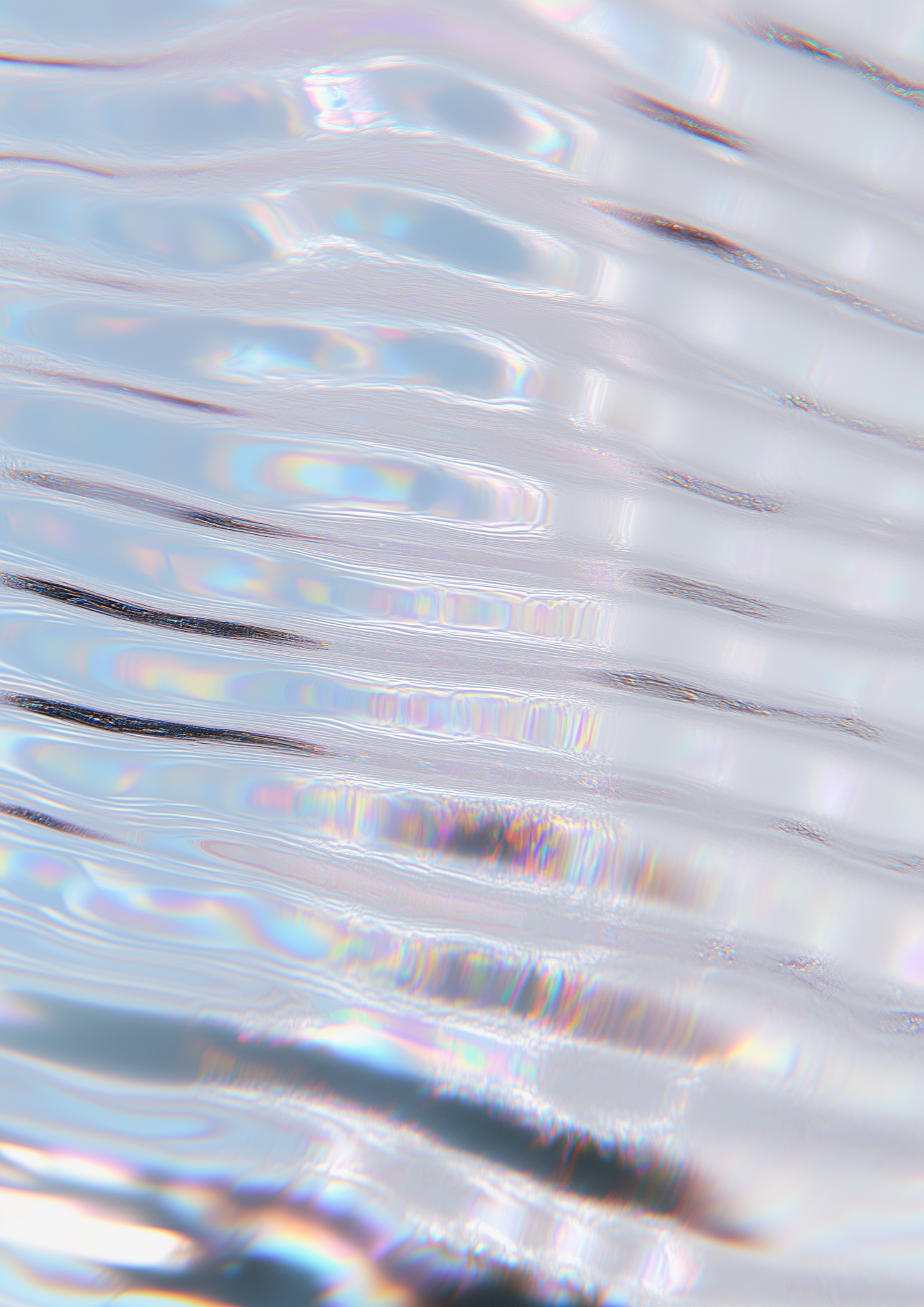 Abstract iridescent waves with a holographic effect, featuring soft blues, pinks, and purples on a blurred white background.