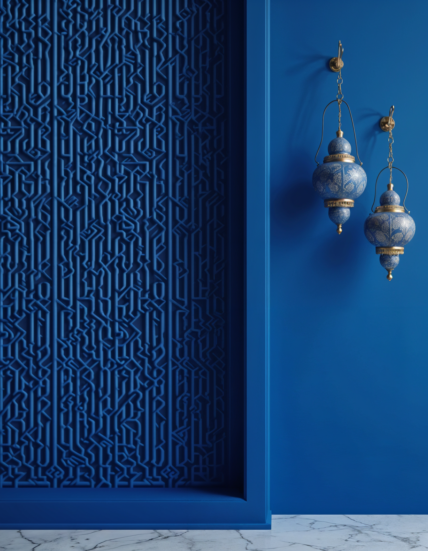 Elegant blue wall with intricate geometric patterns and ornate hanging lanterns, paired with a white marble floor for a luxurious touch.