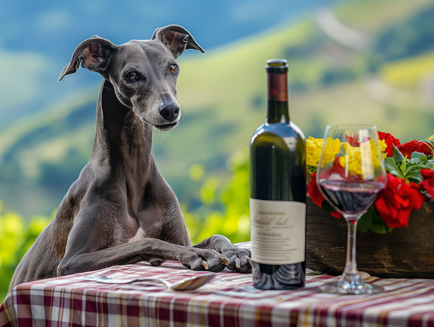 Greyhound dog at a table with wine and flowers, set against a backdrop of rolling green hills.