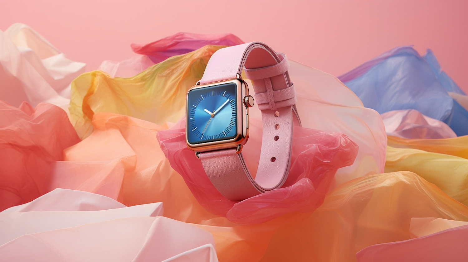 Elegant smartwatch with rose gold frame and pink strap against a pastel backdrop, featuring a vibrant blue dial.