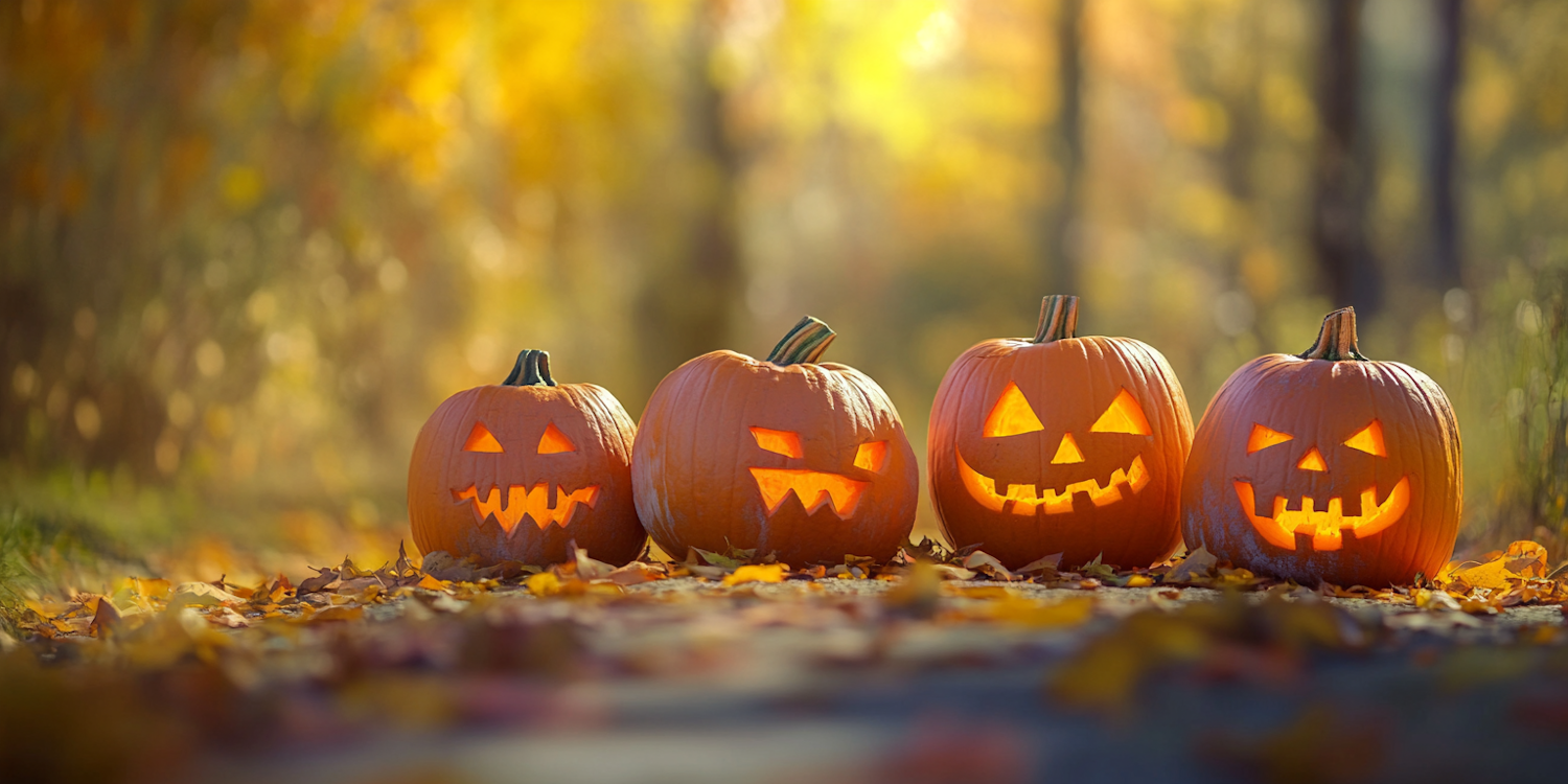 Four glowing jack-o'-lanterns on a leaf-strewn path, surrounded by vibrant autumn foliage, capturing the Halloween spirit.